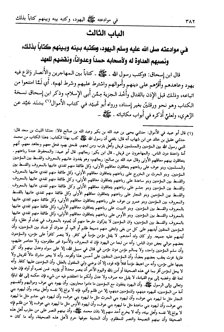 قال ابن إسحاق: «وكتب رسول الله- صلى الله عليه وسلم- كتابا بين المهاجرين والأنصار وادع فيه يهود وعاهدهم وأقرّهم على دينهم وأموالهم واشترط عليهم وشرط لهم» . أي لمّا امتنعوا من إتباعه، وذلك قبل الإذن بالقتال وأخذ الجزية ممن أبى الإسلام، وذكر ابن إسحاق نسخة الكتاب وهو نحو ورقتين بغير إسناد، ورواه أبو عبيد في كتاب الأموال [ (1) ] بسند جيد عن الزّهري، ولعليّ أذكره في أبواب مكاتباته- صلى الله عليه وسلم-.