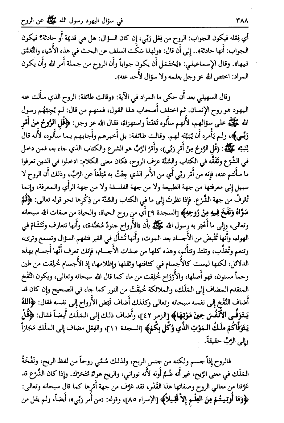 وقال السهيلي بعد أن حكى ما المراد في الآية: «وقالت طائفة: الروح الذي سألت عنه اليهود هو روح الإنسان. ثم اختلف أصحاب هذا القول، فمنهم من قال: لم يجبهم رسول الله صلى الله عليه وسلم على سؤالهم، لأنهم سألوه تعنّتا واستهزاء، فقال الله عز وجل: قُلِ الرُّوحُ مِنْ أَمْرِ رَبِّي، ولم يأمره أن يبيّنه لهم. وقالت طائفة: بل أخبرهم وأجابهم بما سألوه، لأنه قال لنبيه صلى الله عليه وسلم: (قل الرّوح من أمر ربّي) ، وأمر الرّبّ هو الشرع والكتاب الذي جاء به، فمن دخل في الشّرع وتفقّه في الكتاب والسنة عرف الروح، فكان معنى الكلام: ادخلوا في الدين تعرفوا ما سألتم عنه، فإنه من أمر ربّي أي من الأمر الذي جئت به مبلّغا عن الرّب، وذلك أن الروح لا سبيل إلى معرفتها من جهة الطبيعة ولا من جهة الفلسفة ولا من جهة الرأي والمعرفة، وإنما تعرف من جهة الشّرع. فإذا نظرت إلى ما في الكتاب والسنة من ذكرها نحو قوله تعالى: ثُمَّ سَوَّاهُ وَنَفَخَ فِيهِ مِنْ رُوحِهِ [السجدة 9] أي من روح الحياة، والحياة من صفات الله سبحانه وتعالى، وإلى ما أخبر به رسول الله صلى الله عليه وسلم بأن «الأرواح جنود مجنّدة» ، وأنها تتعارف وتتشامّ في الهواء، وأنها تقبض من الأجساد بعد الموت، وأنها تسأل في القبر فتفهم السؤال وتسمع وترى، وتنعم وتعذّب، وتلتذ وتتألم، وهذه كلها من صفات الأجسام، فإنك تعرف أنّها أجسام بهذه الدلائل، لكنها ليست كالأجسام في كثافتها وثقلها وإظلامها، إذ الأجسام خلقت من طين وحمأ مسنون، فهو أصلها، والأرواح خلقت من ماء كما قال الله سبحانه وتعالى، ويكون النّفخ المتقدم المضاف إلى الملك، والملائكة خلقت من النور كما جاء في الصحيح وإن كان قد أضاف النّفخ إلى نفسه سبحانه وتعالى وكذلك أضاف قبض الأرواح إلى نفسه فقال: اللَّهُ يَتَوَفَّى الْأَنْفُسَ حِينَ مَوْتِها [الزمر 42] ، وأضاف ذلك إلى الملك أيضا فقال: قُلْ يَتَوَفَّاكُمْ مَلَكُ الْمَوْتِ الَّذِي وُكِّلَ بِكُمْ [السجدة 11] ، والفعل مضاف إلى الملك مجازا وإلى الرّبّ حقيقة.