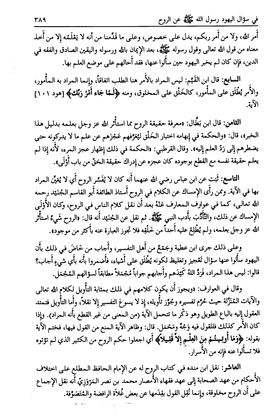 الثامن: قال ابن بطال: «معرفة حقيقة الروح مما استأثر الله عز وجل بعلمه بدليل هذا الخبر» ، قال: «والحكمة في إبهامه اختبار الخلق ليعرّفهم عجزهم عن علم ما لا يدركونه حتى يضطرهم إلى ردّ العلم إليه» . وقال القرطبي: «الحكمة في ذلك إظهار عجز المرء، لأنه إذا لم يعلم حقيقة نفسه مع القطع بوجوده كان عجزه عن إدراك حقيقة الحقّ من باب أولى» .