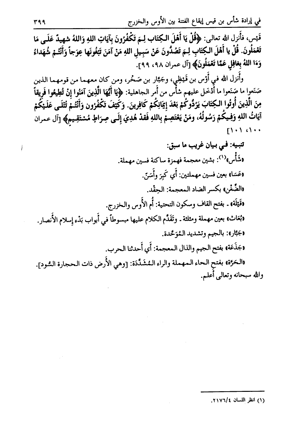 وأنزل الله في أوس بن قيظي، وجبّار بن صخر، ومن كان معهما من قومهما الذين صنعوا ما صنعوا ما أدخل عليهم شأس من أمر الجاهلية: يا أَيُّهَا الَّذِينَ آمَنُوا إِنْ تُطِيعُوا فَرِيقاً مِنَ الَّذِينَ أُوتُوا الْكِتابَ يَرُدُّوكُمْ بَعْدَ إِيمانِكُمْ كافِرِينَ. وَكَيْفَ تَكْفُرُونَ وَأَنْتُمْ تُتْلى عَلَيْكُمْ آياتُ اللَّهِ وَفِيكُمْ رَسُولُهُ، وَمَنْ يَعْتَصِمْ بِاللَّهِ فَقَدْ هُدِيَ إِلى صِراطٍ مُسْتَقِيمٍ [آل عمران 100، 101] تنبيه: في بيان غريب ما سبق: