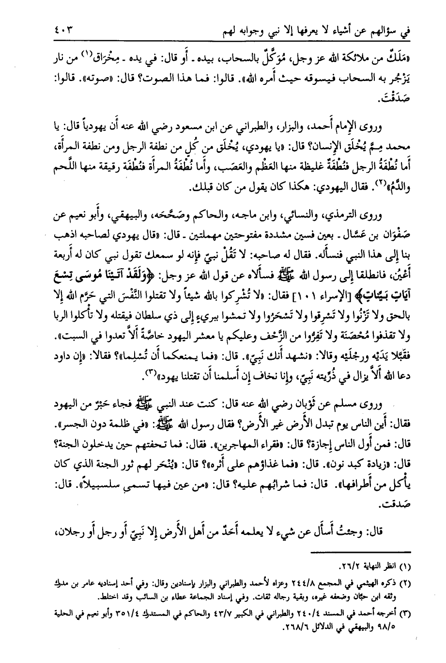 فقبّلا يديه ورجليه وقالا: «نشهد أنك نبي» . قال: «فما يمنعكما أن تسلما» ؟ فقالا: «إن داود دعا الله ألّا يزال في ذرّيته نبيّ، وإنا نخاف إن أسلمنا أن تقتلنا يهود»