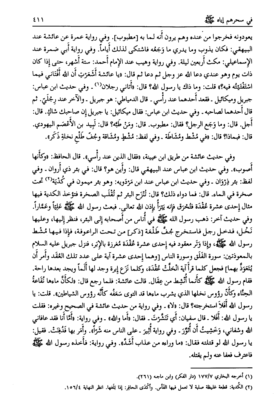 قالت عائشة: فلما رجع قال: «لكأنّ ماءها نقاعة الحنّاء وكأنّ رؤوس نخلها الذي يشرب ماءها قد التوى سعفه كأنّه رؤوس الشياطين» . قلت: يا رسول الله أفلا استخرجته؟ قال: «لا» -