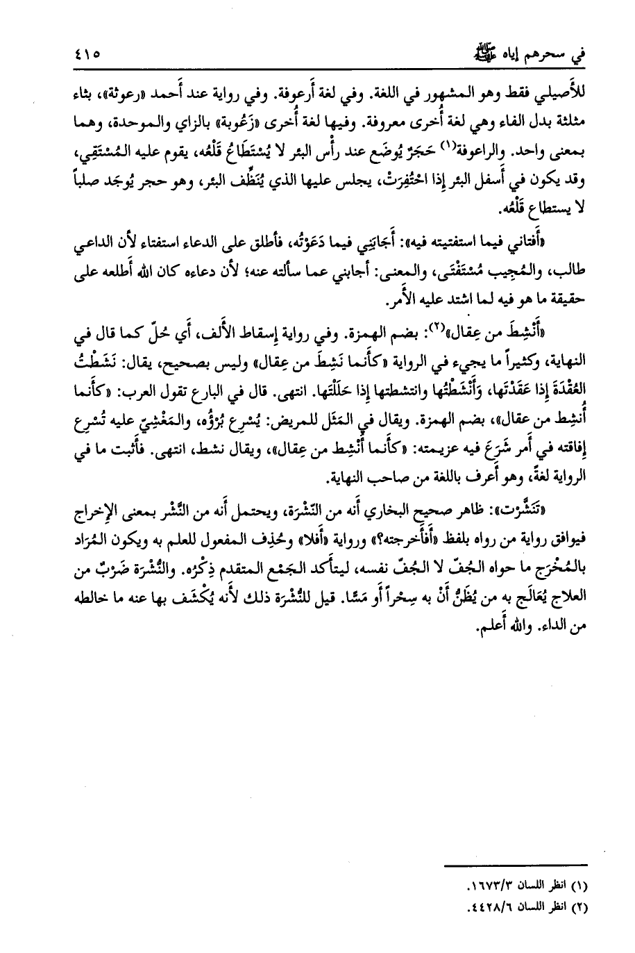 «أنشط من عقال» [ (2) ] : بضم الهمزة. وفي رواية إسقاط الألف، أي حلّ كما قال في النهاية، وكثيرا ما يجيء في الرواية «كأنما نشط من عقال» وليس بصحيح، يقال: نشطت العقدة إذا عقدتها، وأنشطتها وانتشطتها إذا حللتها. انتهى. قال في البارع تقول العرب: «كأنما أنشط من عقال» ، بضم الهمزة. ويقال في المثل للمريض: يسرع برؤه، والمغشيّ عليه تسرع إفاقته في أمر شرع فيه عزيمته: «كأنما أنشط من عقال» ، ويقال نشط، انتهى. فأثبت ما في الرواية لغة، وهو أعرف باللغة من صاحب النهاية.