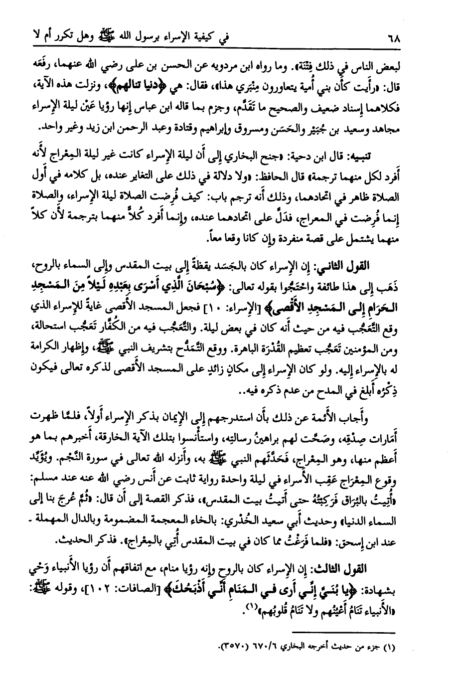 تنبيه: قال ابن دحية: «جنح البخاري إلى أن ليلة الإسراء كانت غير ليلة المعراج لأنه أفرد لكل منهما ترجمة» قال الحافظ: «ولا دلالة في ذلك على التغاير عنده، بل كلامه في أول الصلاة ظاهر في اتحادهما، وذلك أنه ترجم باب: كيف فرضت الصلاة ليلة الإسراء، والصلاة إنما فرضت في المعراج، فدلّ على اتحادهما عنده، وإنما أفرد كلّا منهما بترجمة لأن كلا منهما يشتمل على قصة منفردة وإن كانا وقعا معا.