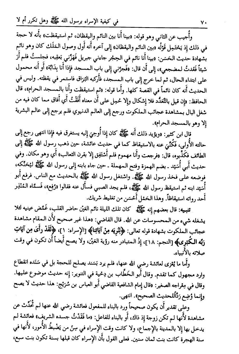 تنبيه: قال بعضهم أنه صلى الله عليه وسلم كان تلك الليلة نائم العين حاضر القلب، غمّض عينيه لئلا يشغله شيء من المحسوسات عن الله. قال القاضي: «هذا غير صحيح لأن المقام مشاهدة عجائب الملكوت بشهادة قوله تعالى: لِنُرِيَهُ مِنْ آياتِنا [الإسراء: 1] ، لَقَدْ رَأى مِنْ آياتِ رَبِّهِ الْكُبْرى [النجم: 18] ، إذ المتبادر منه رؤية العين، ولا يصح أيضاً أن تكون في وقت صلاته بالأنبياء.