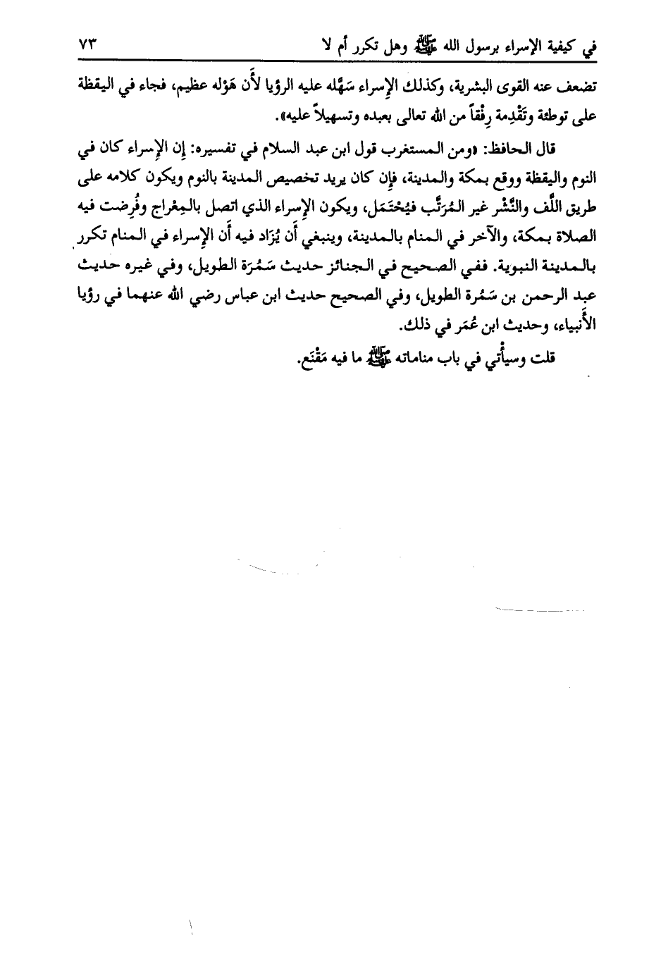 قال الحافظ: «ومن المستغرب قول ابن عبد السلام في تفسيره: إن الإسراء كان في النوم واليقظة ووقع بمكة والمدينة، فإن كان يريد تخصيص المدينة بالنوم ويكون كلامه على طريق اللّف والنّشر غير المرتّب فيحتمل، ويكون الإسراء الذي اتصل بالمعراج وفرضت فيه الصلاة بمكة، والآخر في المنام بالمدينة، وينبغي أن يزاد فيه أن الإسراء في المنام تكرر بالمدينة النبوية. ففي الصحيح في الجنائز حديث سمرة الطويل، وفي غيره حديث عبد الرحمن بن سمرة الطويل، وفي الصحيح حديث ابن عباس رضي الله عنهما في رؤيا الأنبياء، وحديث ابن عمر في ذلك.