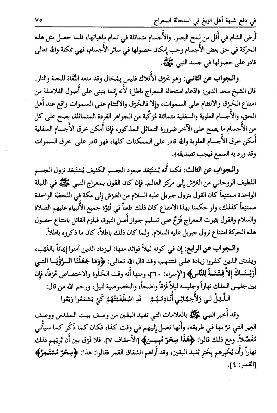 قال الشيخ سعد الدين: «ادّعاء استحالة المعراج باطل، لأنه إنما ينبنى على أصول الفلاسفة من امتناع الخرق والالتئام على السموات، وإلا فالخرق والالتئام على السموات واقع عند أهل الحق، والأجسام العلوية والسفلية متماثلة مركّبة من الجواهر الفردة المتماثلة، يصح على كل من الأجسام ما يصح على الآخر ضرورة التماثل المذكور، فإذا أمكن خرق الأجسام السفلية أمكن خرق الأجسام العلوية والله قادر على الممكنات كلها، فهو قادر على خرق السموات وقد ورد به السمع فيجب تصديقه» .