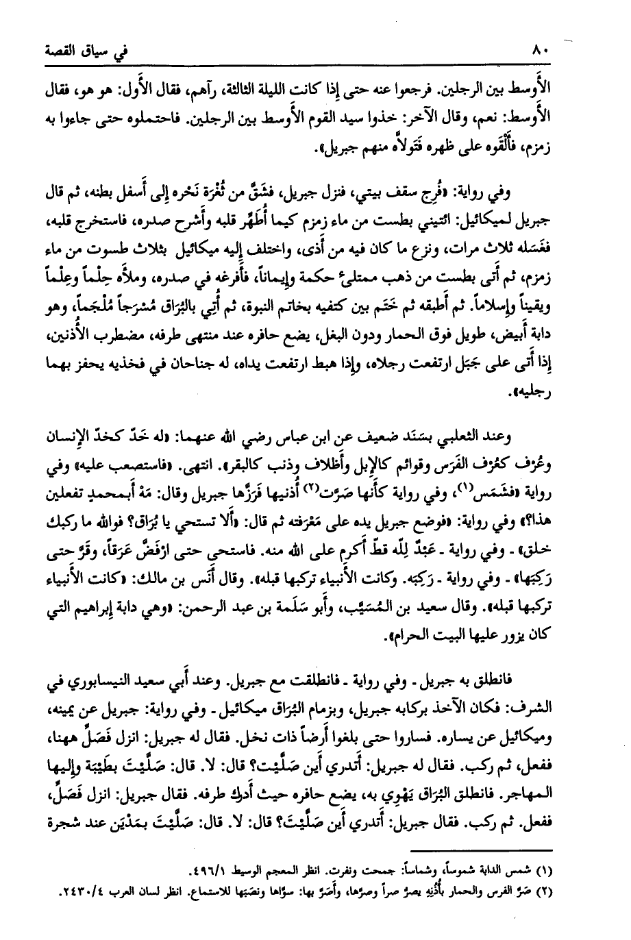 وفي رواية: «فرج سقف بيتي، فنزل جبريل، فشقّ من ثغرة نحره إلى أسفل بطنه، ثم قال جبريل لميكائيل: ائتيني بطست من ماء زمزم كيما أطهّر قلبه وأشرح صدره، فاستخرج قلبه، فغسله ثلاث مرات، ونزع ما كان فيه من أذى، واختلف إليه ميكائيل بثلاث طسوت من ماء زمزم، ثم أتى بطست من ذهب ممتلئ حكمة وإيمانا، فأفرغه في صدره، وملأه حلما وعلما ويقينا وإسلاما. ثم أطبقه ثم ختم بين كتفيه بخاتم النبوة، ثم أتي بالبراق مسرجا ملجما، وهو دابة أبيض، طويل فوق الحمار ودون البغل، يضع حافره عند منتهى طرفه، مضطرب الأذنين، إذا أتى على جبل ارتفعت رجلاه، وإذا هبط ارتفعت يداه، له جناحان في فخذيه يحفز بهما رجليه» .