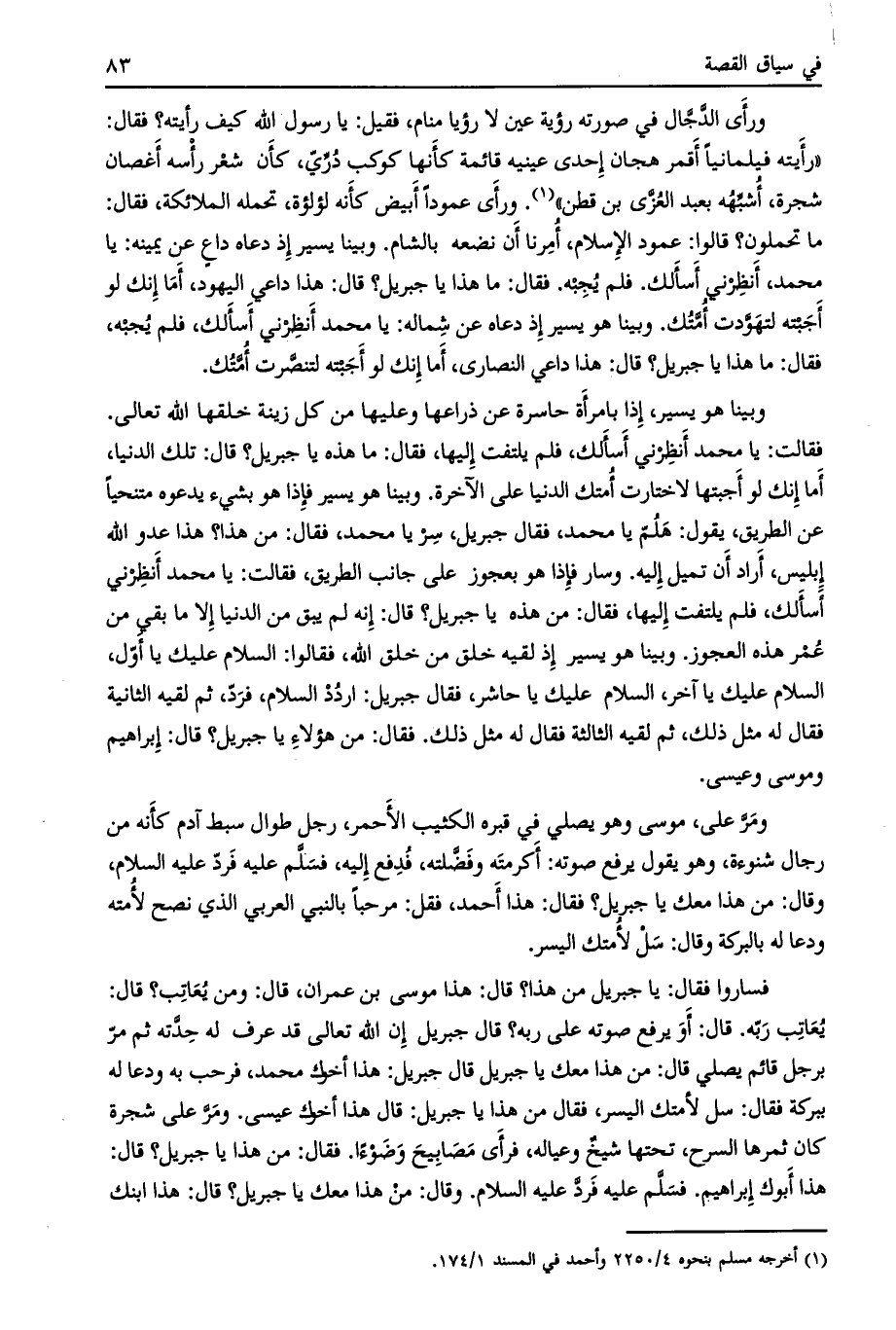 ما تحملون؟ قالوا: عمود الإسلام، أمرنا أن نضعه بالشام. وبينا يسير إذ دعاه داع عن يمينه: يا محمد، أنظرني أسألك. فلم يجبه. فقال: ما هذا يا جبريل؟ قال: هذا داعي اليهود، أما إنك لو أجبته لتهوّدت أمّتك. وبينا هو يسير إذ دعاه عن شماله: يا محمد أنظرني أسألك، فلم يجبه، فقال: ما هذا يا جبريل؟ قال: هذا داعي النصارى، أما إنك لو أجبته لتنصّرت أمّتك.