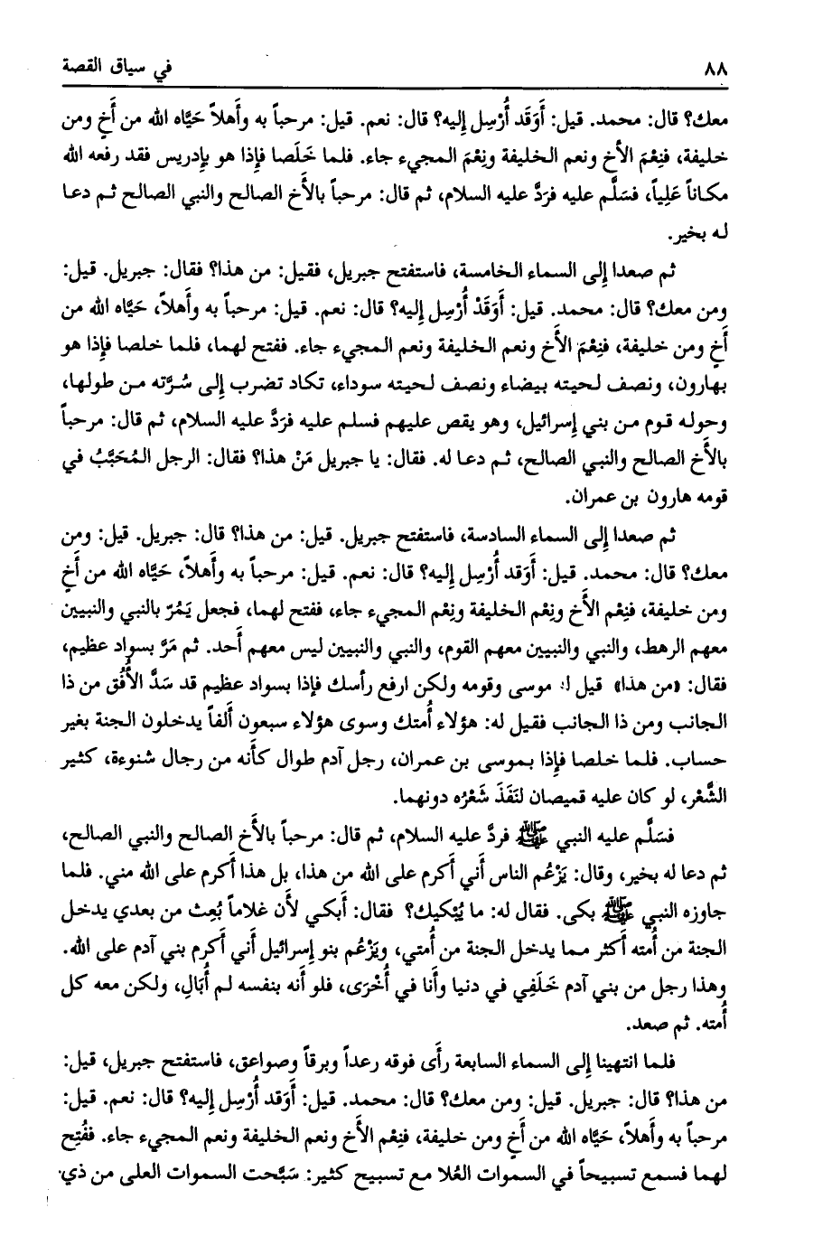 ومن معك؟ قال: محمد. قيل: أوقد أرسل إليه؟ قال: نعم. قيل: مرحبا به وأهلا، حيّاه الله من أخ ومن خليفة، فنعم الأخ ونعم الخليفة ونعم المجيء جاء. ففتح لهما، فلما خلصا فإذا هو بهارون، ونصف لحيته بيضاء ونصف لحيته سوداء، تكاد تضرب إلى سرّته من طولها، وحوله قوم من بني إسرائيل، وهو يقص عليهم فسلم عليه فردّ عليه السلام، ثم قال: مرحبا بالأخ الصالح والنبي الصالح، ثم دعا له. فقال: يا جبريل من هذا؟ فقال: الرجل المحبّب في قومه هارون بن عمران.