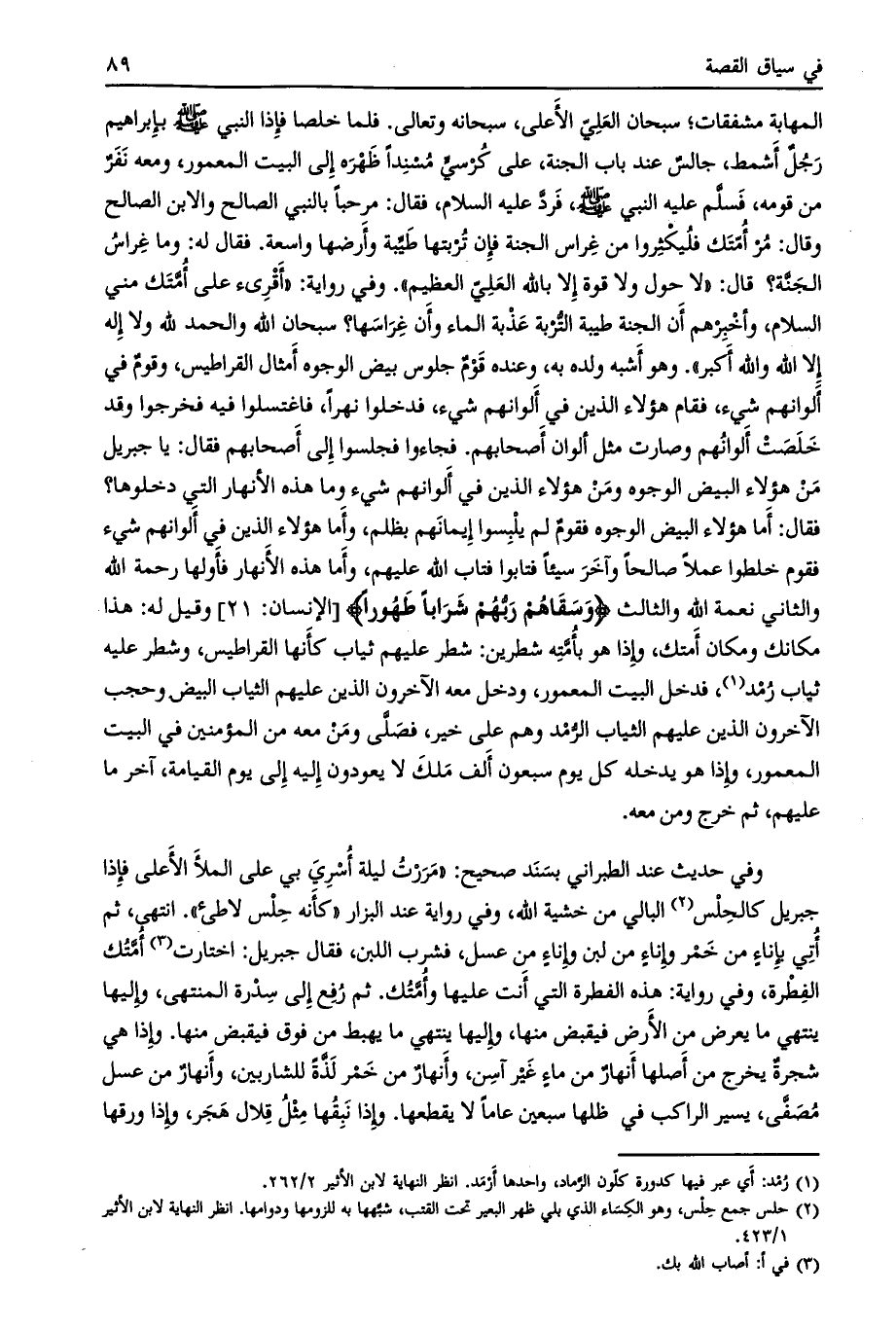 وفي رواية: هذه الفطرة التي أنت عليها وأمّتك. ثم رفع إلى سدرة المنتهى، وإليها ينتهي ما يعرض من الأرض فيقبض منها، وإليها ينتهي ما يهبط من فوق فيقبض منها. وإذا هي شجرة يخرج من أصلها أنهار من ماء غير آسن، وأنهار من خمر لذّة للشاربين، وأنهار من عسل مصفّى، يسير الراكب في ظلها سبعين عاما لا يقطعها. وإذا نبقها مثل قلال هجر، وإذا ورقها