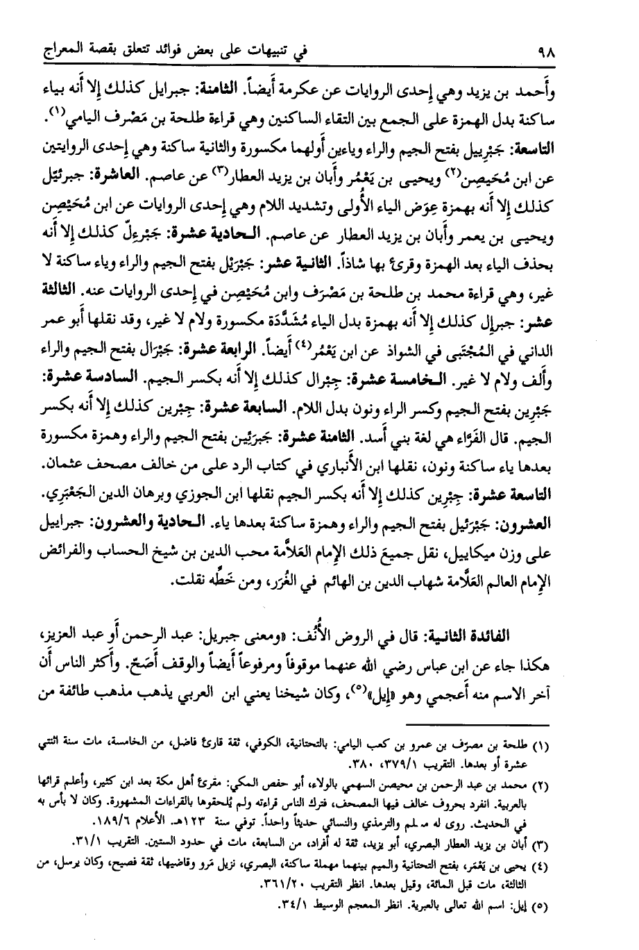 العشرون: جبرئيل بفتح الجيم والراء وهمزة ساكنة بعدها ياء. الحادية والعشرون: جبراييل على وزن ميكاييل، نقل جميع ذلك الإمام العلّامة محب الدين بن شيخ الحساب والفرائض الإمام العالم العلامة شهاب الدين بن الهائم في الغرر، ومن خطه نقلت.