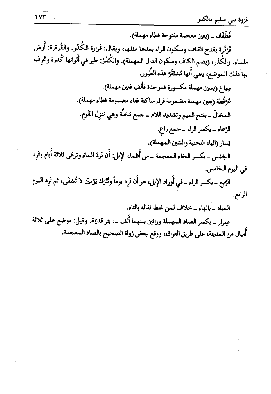 قرقرة بفتح القاف وسكون الراء بعدها مثلها، ويقال: قرارة الكدر. والقرقرة: أرض ملساء. والكدر، (بضم الكاف وسكون الدال المهملة) . والكدر: طير في ألوانها كدرة وعرف بها ذلك الموضع، يعني أنها مستقرّ هذه الطّيور.