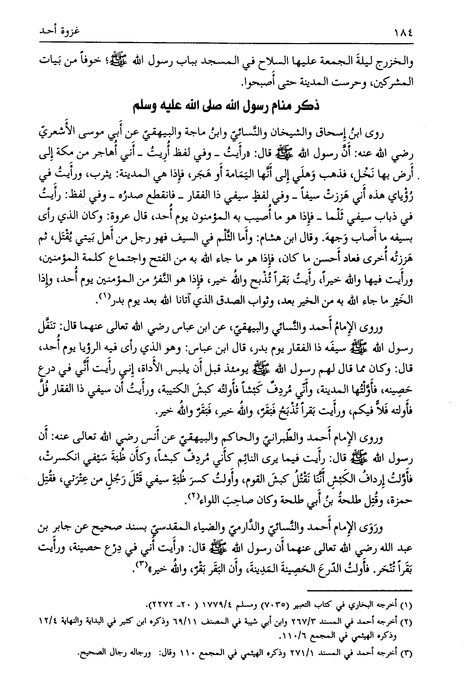 روى ابن إسحاق والشيخان والنسائي وابن ماجة والبيهقي عن أبي موسى الأشعري رضي الله عنه: أن رسول الله صلى الله عليه وسلم قال: «رأيت- وفي لفظ أريت- أني أهاجر من مكة إلى أرض بها نخل، فذهب وهلي إلى أنّها اليمامة أو هجر، فإذا هي المدينة: يثرب، ورأيت في رؤياي هذه أني هززت سيفا- وفي لفظ سيفي ذا الفقار- فانقطع صدره- وفي لفظ: رأيت في ذباب سيفي ثلما- فإذا هو ما أصيب به المؤمنون يوم أحد،