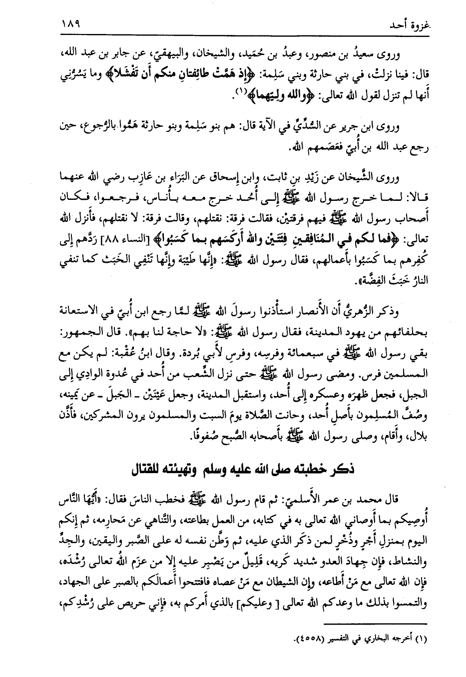 وروى الشيخان عن زيد بن ثابت، وابن إسحاق عن البراء بن عازب رضي الله عنهما قالا: لما خرج رسول الله صلى الله عليه وسلم إلى أحد خرج معه بأناس، فرجعوا، فكان أصحاب رسول الله صلى الله عليه وسلم فيهم فرقتين، فقالت فرقة: نقتلهم، وقالت فرقة: لا نقتلهم، فانزل الله تعالى: فَما لَكُمْ فِي الْمُنافِقِينَ فِئَتَيْنِ وَاللَّهُ أَرْكَسَهُمْ بِما كَسَبُوا [النساء 88] ردّهم إلى كفرهم بما كسبوا بأعمالهم،
