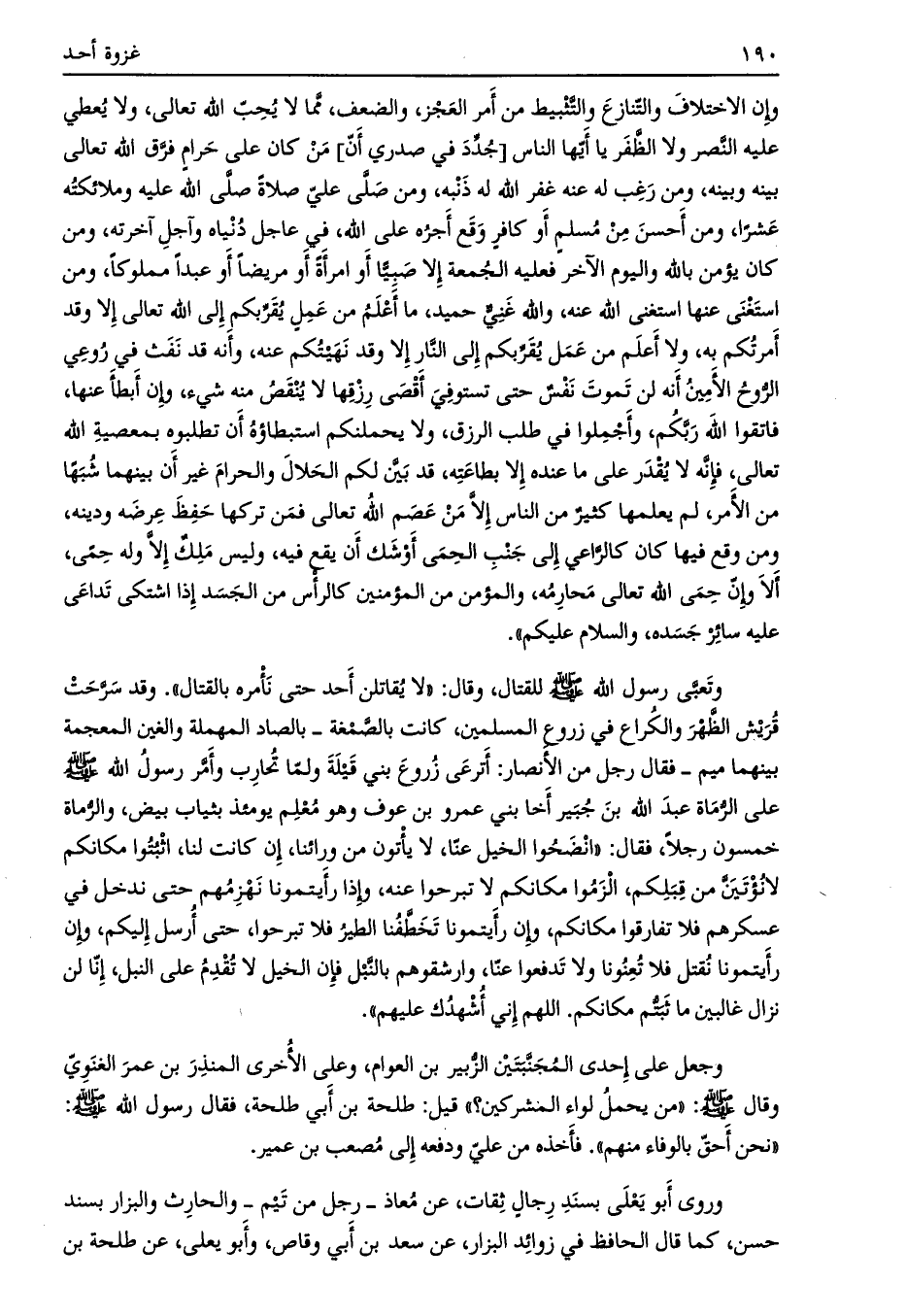 وإن الاختلاف والتّنازع والتّثبيط من أمر العجز، والضعف، ممّا لا يحبّ الله تعالى، ولا يعطي عليه النّصر ولا الظّفر يا أيها الناس [جدّد في صدري أنّ] من كان على حرام فرّق الله تعالى بينه وبينه، ومن رغب له عنه غفر الله له ذنبه، ومن صلى علي صلاة صلى الله عليه وملائكته عشرا، ومن أحسن من مسلم أو كافر وقع أجره على الله، في عاجل دنياه وآجل آخرته، ومن كان يؤمن بالله واليوم الآخر فعليه الجمعة إلا صبيّا أو امرأة أو مريضا أو عبدا مملوكا، ومن استغنى عنها استغنى الله عنه، والله غنيّ حميد، ما أعلم من عمل يقرّبكم إلى الله تعالى إلا وقد أمرتكم به، ولا أعلم من عمل يقرّبكم إلى النّار إلا وقد نهيتكم عنه، وأنه قد نفث في روعي الرّوح الأمين أنه لن تموت نفس حتى تستوفي أقصى رزقها لا ينقص منه شيء، وإن أبطأ عنها، فاتقوا الله ربّكم، وأجملوا في طلب الرزق، ولا يحملنكم استبطاؤه أن تطلبوه بمعصية الله تعالى، فإنه لا يقدر على ما عنده إلا بطاعته، قد بيّن لكم الحلال والحرام غير أن بينهما شبها من الأمر، لم يعلمها كثير من الناس إلّا من عصم الله تعالى فمن تركها حفظ عرضه ودينه، ومن وقع فيها كان كالرّاعي إلى جنب الحمى أوشك أن يقع فيه، وليس ملك إلّا وله حمى، ألا وإنّ حمى الله تعالى محارمه، والمؤمن من المؤمنين كالرأس من الجسد إذا اشتكى تداعى عليه سائر جسده، والسلام عليكم» .