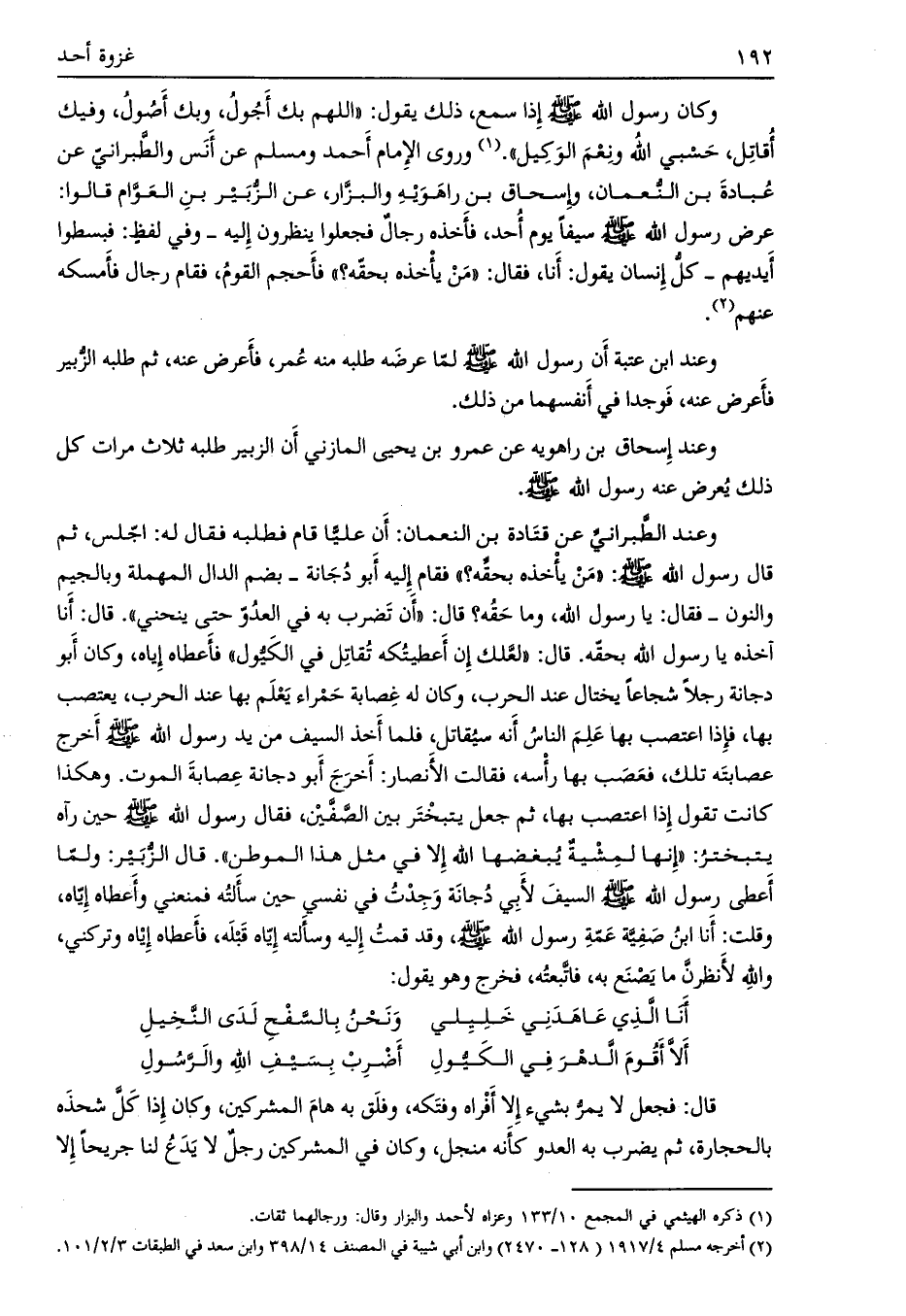 وروى الإمام أحمد ومسلم عن أنس والطبراني عن عبادة بن النّعمان، وإسحاق بن راهويه والبزّار، عن الزبير بن العوّام قالوا: عرض رسول الله صلى الله عليه وسلم سيفا يوم أحد، فأخذه رجال فجعلوا ينظرون إليه- وفي لفظ: فبسطوا أيديهم- كلّ إنسان يقول: أنا، فقال: «من يأخذه بحقّه؟» فأحجم القوم، فقام رجال فأمسكه عنهم