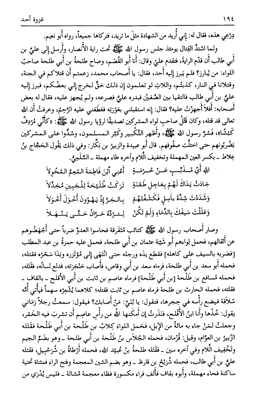 ولما اشتدّ القتال يومئذ جلس رسول الله صلى الله عليه وسلم تحت راية الأنصار، وأرسل إلى علي بن أبي طالب أن قدّم الراية، فتقدم عليّ وقال: أنا أبو القصم، وصاح طلحة بن أبي طلحة صاحب اللواء: من يبارز؟ فلم يبرز إليه أحد، فقال: يا أصحاب محمد، زعمتم أن قتلاكم في الجنة، وقتلانا في النار، كذبتم، واللات لو تعلمون إن ذلك حقّ لخرج إلي بعضكم، فبرز إليه علي بن أبي طالب فالتقيا بين الصّفين فبدره عليّ فصرعه، ولم يجهز عليه، فقال له بعض أصحابه: أفلا أجهزت عليه؟ فقال: إنه استقبلني بعورته فعطفني عليه الرّحم، وعرفت أن الله تعالى قد قتله،