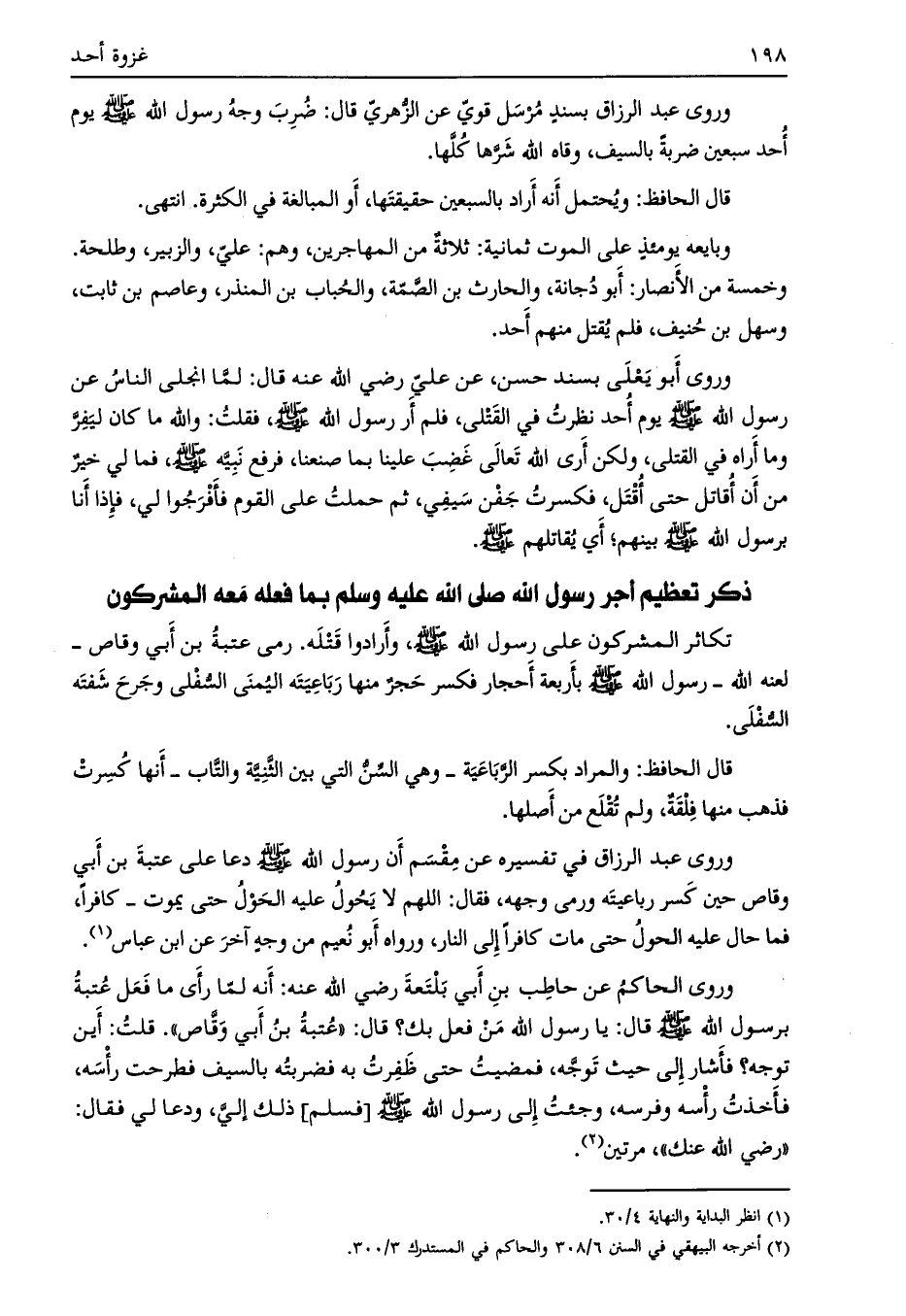 وروى عبد الرزاق بسند مرسل قويّ عن الزهري قال: ضرب وجه رسول الله صلى الله عليه وسلم يوم أحد سبعين ضربة بالسيف، وقاه الله شرّها كلّها.