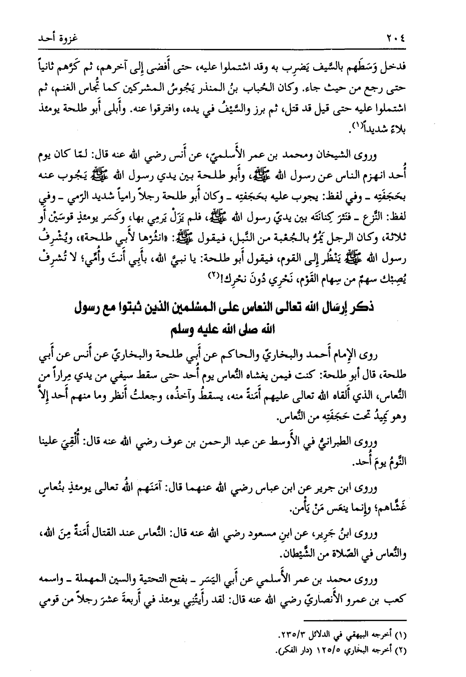 روى الإمام أحمد والبخاريّ والحاكم عن أبي طلحة والبخاري عن أنس عن أبي طلحة، قال أبو طلحة: كنت فيمن يغشاه النّعاس يوم أحد حتى سقط سيفي من يدي مرارا من النّعاس، الذي ألقاه الله تعالى عليهم أمنة منه، يسقط وآخذه، وجعلت أنظر وما منهم أحد إلا وهو يميد تحت حجفته من النّعاس.