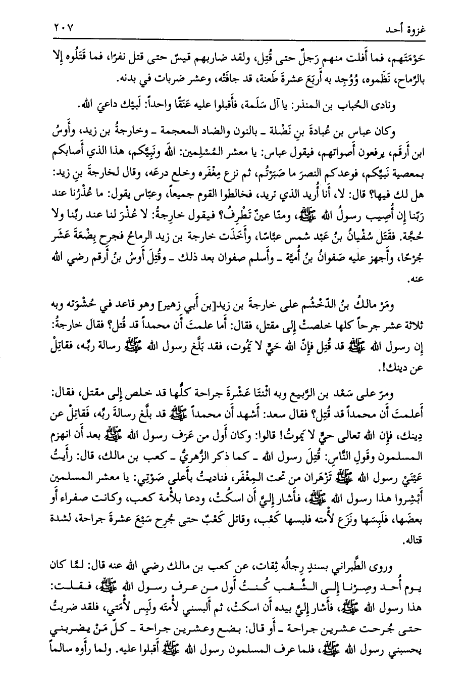 أعلمت إن محمدا قد قتل؟ فقال سعد: أشهد أن محمدا صلى الله عليه وسلم قد بلّغ رسالة ربه، فقاتل عن دينك، فإن الله تعالى حي لا يموت! قالوا: وكان أول من عرف رسول الله صلى الله عليه وسلم بعد أن انهزم المسلمون وقول النّاس: قتل رسول الله- كما ذكر الزّهريّ- كعب بن مالك، قال: رأيت عيني رسول الله صلى الله عليه وسلم تزهران من تحت المغفر، فناديت بأعلى صوتي: يا معشر المسلمين أبشروا هذا رسول الله صلى الله عليه وسلم، فأشار إلي أن اسكت، ودعا بلأمة كعب، وكانت صفراء أو بعضها، فلبسها ونزع لأمته فلبسها كعب، وقاتل كعب حتى جرح سبع عشرة جراحة، لشدة قتاله.