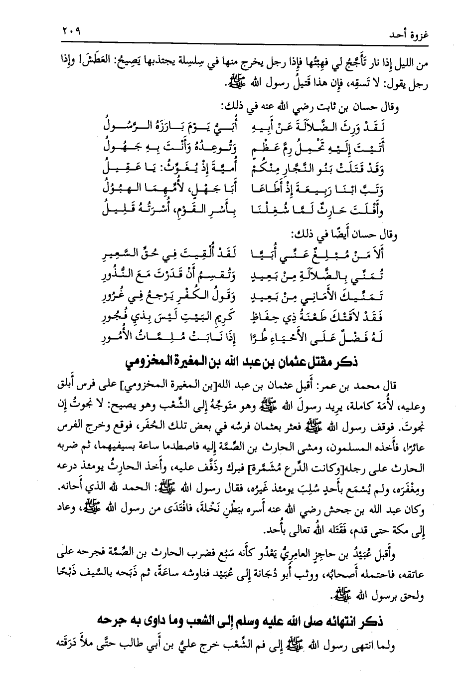 قال محمد بن عمر: أقبل عثمان بن عبد الله [بن المغيرة المخزومي] على فرس أبلق وعليه، لأمة كاملة، يريد رسول الله صلى الله عليه وسلم وهو متوجّه إلى الشّعب وهو يصيح: لا نجوت إن نجوت. فوقف رسول الله صلى الله عليه وسلم فعثر بعثمان فرسه في بعض تلك الحفر، فوقع وخرج الفرس عائرا، فأخذه المسلمون، ومشى الحارث بن الصّمّة إليه فاصطدما ساعة بسيفيهما، ثم ضربه الحارث على رجله [وكانت الدّرع مشمّرة] فبرك وذفّف عليه، وأخذ الحارث يومئذ درعه ومغفره، ولم يسمع بأحد سلب يومئذ غيره،