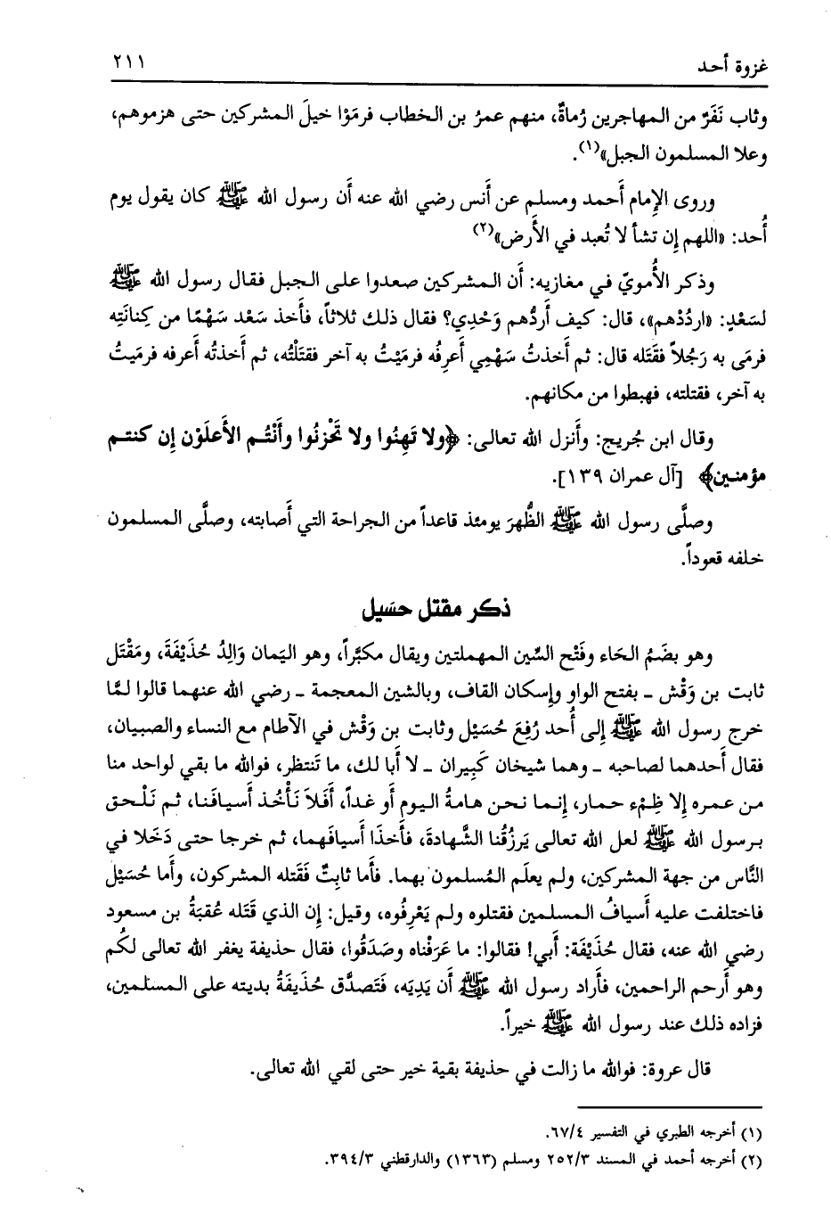 وهو بضم الحاء وفتح السّين المهملتين ويقال مكبّرا، وهو اليمان والد حذيفة، ومقتل ثابت بن وقش- بفتح الواو وإسكان القاف، وبالشين المعجمة- رضي الله عنهما قالوا لمّا خرج رسول الله صلى الله عليه وسلم إلى أحد رفع حسيل وثابت بن وقش في الآطام مع النساء والصبيان، فقال أحدهما لصاحبه- وهما شيخان كبيران- لا أبا لك، ما تنتظر، فو الله ما بقي لواحد منا من عمرة إلا ظمء حمار، إنما نحن هامة اليوم أو غدا، أفلا نأخذ أسيافنا، ثم نلحق برسول الله صلى الله عليه وسلم لعل الله تعالى يرزقنا الشّهادة، فأخذا أسيافهما، ثم خرجا حتى دخلا في الناس من جهة المشركين، ولم يعلم المسلمون بهما. فأما ثابت فقتله المشركون، وأما حسيل فاختلفت عليه أسياف المسلمين فقتلوه ولم يعرفوه، وقيل: إن الذي قتله عقبة بن مسعود رضي الله عنه، فقال حذيفة: أبي! فقالوا: ما عرفناه وصدقوا، فقال حذيفة يغفر الله تعالى لكم وهو أرحم الراحمين، فأراد رسول الله صلى الله عليه وسلم أن يديه، فتصدّق حذيفة بديته على المسلمين، فزاده ذلك عند رسول الله صلى الله عليه وسلم خيرا.