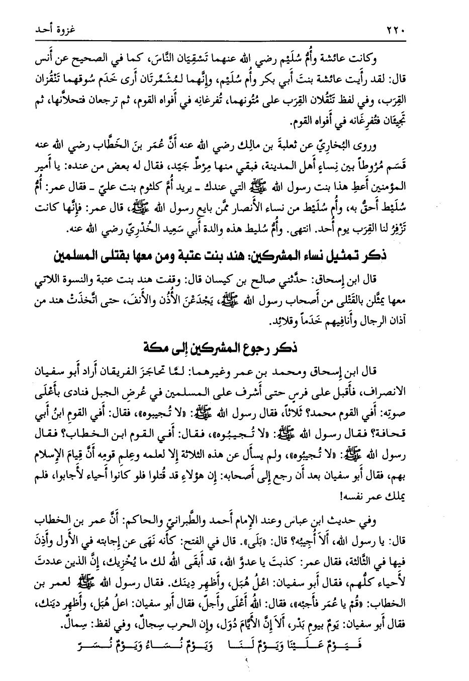 قال ابن إسحاق ومحمد بن عمر وغيرهما: لمّا تحاجز الفريقان أراد أبو سفيان الانصراف، فأقبل على فرس حتى أشرف على المسلمين في عرض الجبل فنادى بأعلى صوته: أفي القوم محمد؟ ثلاثا، فقال رسول الله صلى الله عليه وسلم: «لا تجيبوه» ، فقال: أفي القوم ابن أبي قحافة؟ فقال رسول الله صلى الله عليه وسلم: «لا تجيبوه» ، فقال: أفي القوم ابن الخطاب؟ فقال رسول الله صلى الله عليه وسلم: «لا تجيبوه» ،