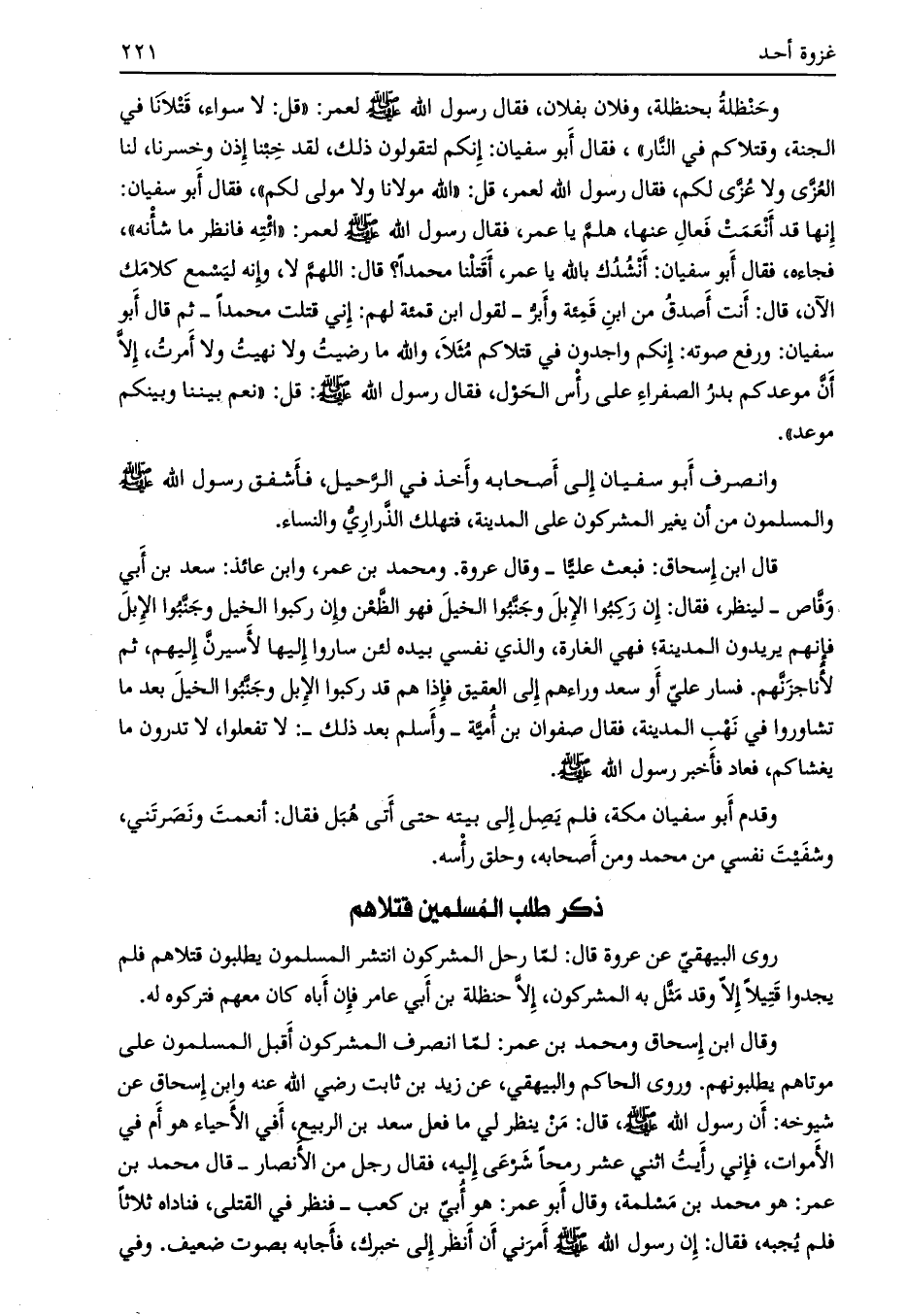 روى البيهقي عن عروة قال: لما رحل المشركون انتشر المسلمون يطلبون قتلاهم فلم يجدوا قتيلا إلّا وقد مثّل به المشركون، إلّا حنظلة بن أبي عامر فإن أباه كان معهم فتركوه له.
