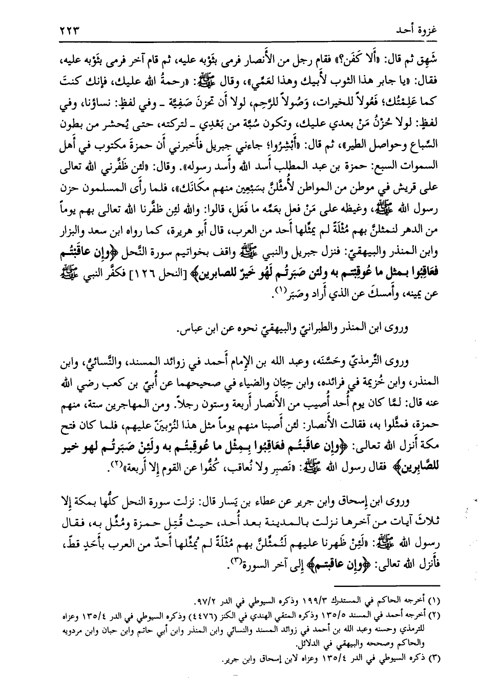 فلما رأى المسلمون حزن رسول الله صلى الله عليه وسلم، وغيظه على من فعل بعمّه ما فعل، قالوا: والله لئن ظفّرنا الله تعالى بهم يوما من الدهر لنمثلنّ بهم مثلة لم يمثّلها أحد من العرب، قال أبو هريرة، كما رواه ابن سعد والبزار وابن المنذر والبيهقي: فنزل جبريل والنبي صلى الله عليه وسلم واقف بخواتيم سورة النّحل وَإِنْ عاقَبْتُمْ فَعاقِبُوا بِمِثْلِ ما عُوقِبْتُمْ بِهِ وَلَئِنْ صَبَرْتُمْ لَهُوَ خَيْرٌ لِلصَّابِرِينَ [النحل 126] فكفّر النبي صلى الله عليه وسلم عن يمينه، وأمسك عن الذي أراد وصبر [ (1) ] .