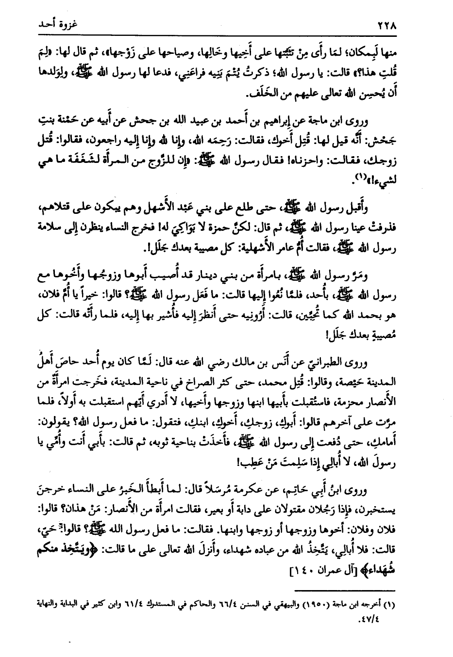 فلان وفلان: أخوها وزوجها أو زوجها وابنها. فقالت: ما فعل رسول الله صلى الله عليه وسلم؟ قالوا: حيّ، قالت: فلا أبالي، يتّخذ الله من عباده شهداء، وأنزل الله تعالى على ما قالت: وَيَتَّخِذَ مِنْكُمْ شُهَداءَ [آل عمران 140]