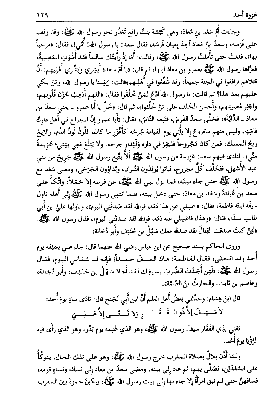 وروى الحاكم بسند صحيح عن ابن عباس رضي الله عنهما قال: جاء علي بسيفه يوم أحد وقد انحنى، فقال لفاطمة: هاك السيف حميدا، فإنه قد شفاني اليوم، فقال رسول الله صلى الله عليه وسلم: «لئن أجدت الضّرب بسيفك لقد أجاد سهل بن حنيف، وأبو دجانة، وعاصم بن ثابت، والحارث بن الصّمّة» .