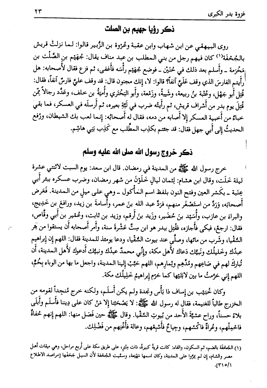 روى البيهقي عن ابن شهاب وابن عقبة وعروة بن الزبير قالوا: لما نزلت قريش بالجحفة [ (1) ] كان فيهم رجل من بني المطلب بن عبد مناف يقال: جهيم بن الصلت بن مخرمة- وأسلم بعد ذلك في حنين- فوضع جهيم رأسه فأغفى، ثم فزع فقال لأصحابه: هل رأيتم الفارس الذي وقف عليّ آنفا؟ قالوا: لا، إنك مجنون قال: قد وقف عليّ فارس آنفا، فقال: