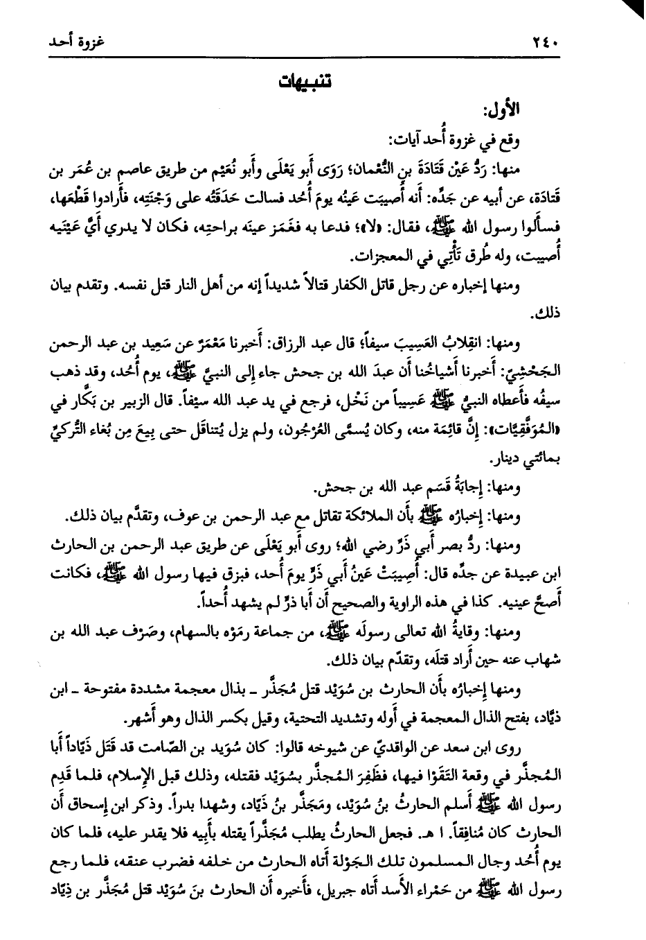 ومنها: انقلاب العسيب سيفا، قال عبد الرزاق: أخبرنا معمر عن سعيد بن عبد الرحمن الجحشيّ: أخبرنا أشياخنا إن عبد الله بن جحش جاء إلى النبي صلى الله عليه وسلم، يوم أحد، وقد ذهب سيفه فأعطاه النبي صلّى الله عليه وسلم عسيبا من نخل، فرجع في يد عبد الله سيفا. قال الزبير بن بكار في «الموفقيات» : إنّ قائمة منه، وكان يسمى العرجون، ولم يزل يتناقل حتى بيع من بغاء التركي بمائتي دينار.