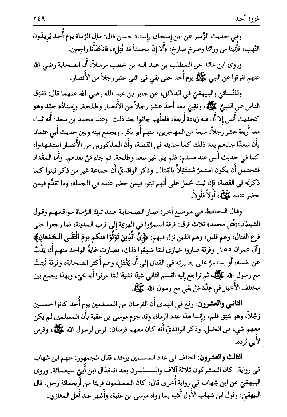وقال الحافظ في موضع آخر: صار الصحابة عند ترك الرّماة مواقعهم وقول الشيطان: «قتل محمد» ثلاث فرق: فرقة استمرّوا في الهزيمة إلى قرب المدينة، فما رجعوا حتى فرغ القتال، وهم قليل، وهم الذين نزل فيهم: إِنَّ الَّذِينَ تَوَلَّوْا مِنْكُمْ يَوْمَ الْتَقَى الْجَمْعانِ [آل عمران 155] وفرقة صاروا حيارى لما سمعوا ذلك، فصارت غاية الواحد منهم أن يذبّ عن نفسه، أو يستمرّ على بصيرته في القتال إلى أن يقتل، وهم أكثر الصحابة، وفرقة ثبتت مع رسول الله صلى الله عليه وسلم، ثم تراجع إليه القسم الثاني شيئا فشيئا لمّا عرفوا أنه حيّ، وبهذا يجمع بين مختلف الأخبار في عدّة من بقي مع رسول الله صلى الله عليه وسلم.