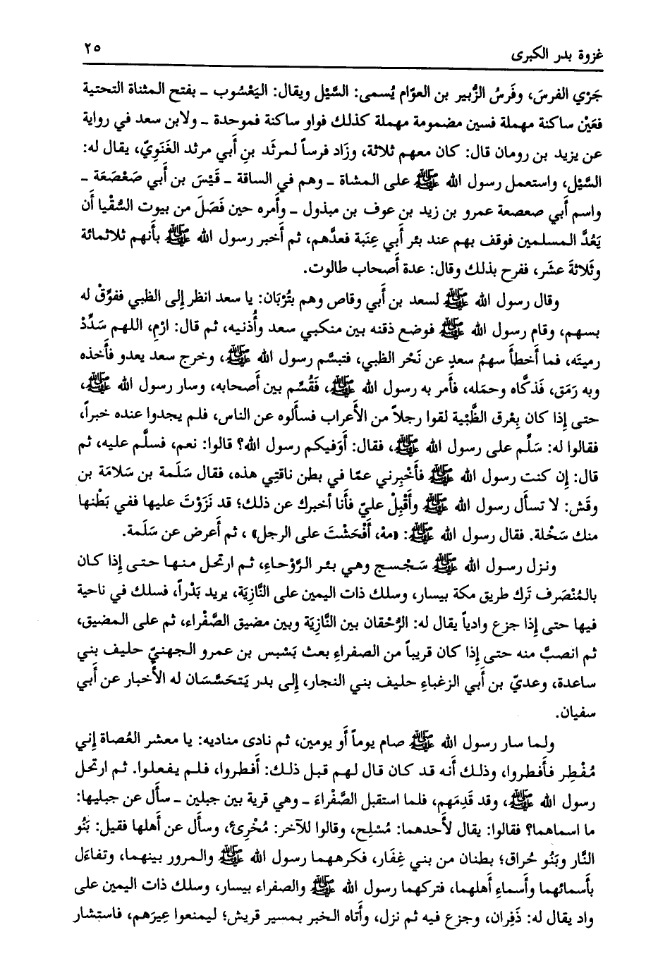 ما اسماهما؟ فقالوا: يقال لأحدهما: مسلح، وقالوا للآخر: مخرئ، وسأل عن أهلها فقيل: بنو النّار وبنو حراق، بطنان من بني غفار، فكرههما رسول الله صلى الله عليه وسلم والمرور بينهما، وتفاءل بأسمائهما وأسماء أهلهما، فتركهما رسول الله صلى الله عليه وسلم والصفراء بيسار، وسلك ذات اليمين على واد يقال له: ذفران، وجزع فيه ثم نزل، وأتاه الخبر بمسير قريش، ليمنعوا عيرهم، فاستشار