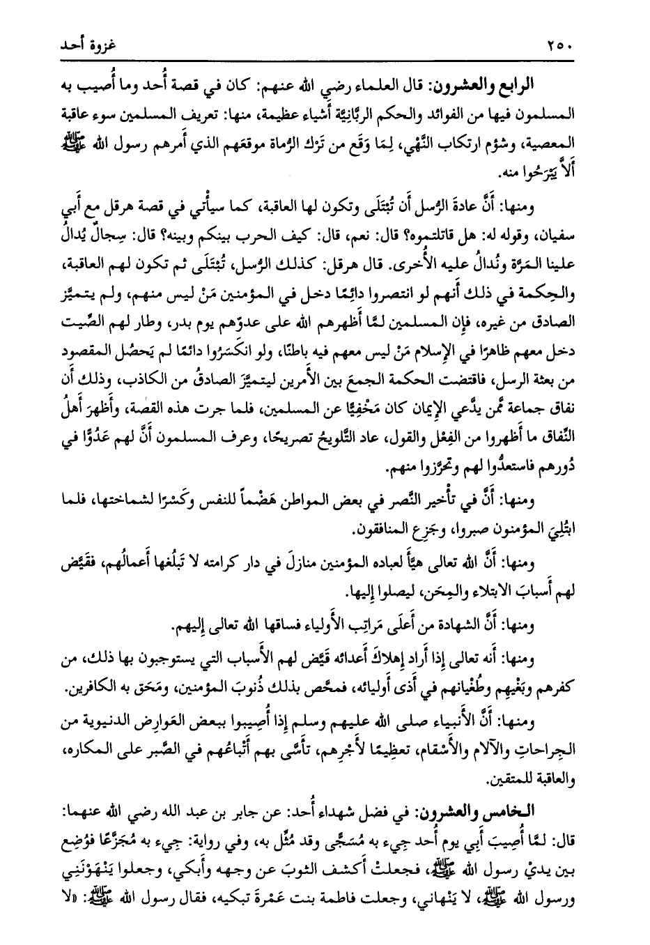 الرابع والعشرون: قال العلماء رضي الله عنهم: كان في قصة أحد وما أصيب به المسلمون فيها من الفوائد والحكم الربّانيّة أشياء عظيمة، منها: تعريف المسلمين سوء عاقبة المعصية، وشؤم ارتكاب النّهي، لما وقع من ترك الرّماة موقعهم الذي أمرهم رسول الله صلى الله عليه وسلم ألّا يبرحوا منه.