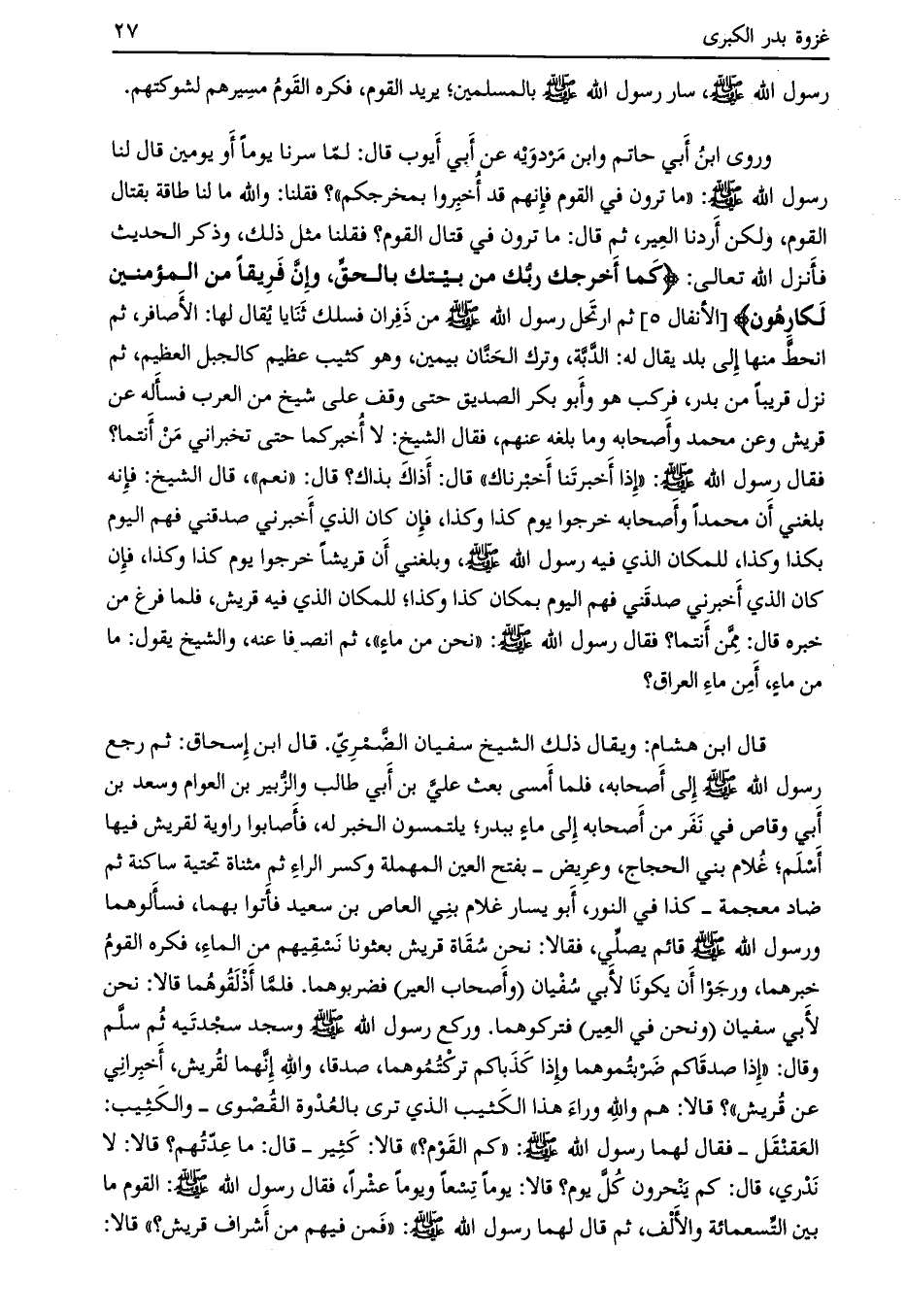 وروى ابن أبي حاتم وابن مردويه عن أبي أيوب قال: لمّا سرنا يوما أو يومين قال لنا رسول الله صلى الله عليه وسلم: «ما ترون في القوم فإنهم قد أخبروا بمخرجكم» ؟ فقلنا: والله ما لنا طاقة بقتال القوم، ولكن أردنا العير، ثم قال: ما ترون في قتال القوم؟ فقلنا مثل ذلك، وذكر الحديث فانزل الله تعالى: كَما أَخْرَجَكَ رَبُّكَ مِنْ بَيْتِكَ بِالْحَقِّ، وَإِنَّ فَرِيقاً مِنَ الْمُؤْمِنِينَ لَكارِهُونَ [الأنفال 5] ثم ارتحل رسول الله صلى الله عليه وسلم من ذفران فسلك ثنايا يقال لها: الأصافر، ثم انحطّ منها إلى بلد يقال له: الدّبّة، وترك الحنّان بيمين، وهو كثيب عظيم كالجبل العظيم، ثم نزل قريبا من بدر، فركب هو وأبو بكر الصديق حتى وقف على شيخ من العرب فسأله عن قريش وعن محمد وأصحابه وما بلغه عنهم، فقال الشيخ: لا أخبركما حتى تخبراني من أنتما؟