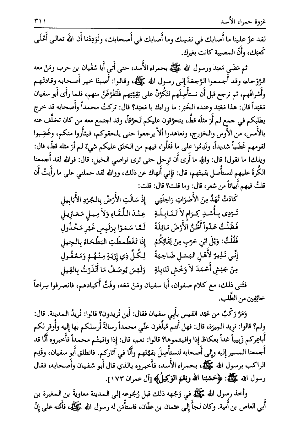 ولم؟ قالوا: نريد الميرة، قال: فهل أنتم مبلّغون عنّي محمدا رسالة أرسلكم بها إليه وأوقر لكم أباعركم زبيبا غدا بعكاظ إذا وافيتموها؟ قالوا: نعم، قال: إذا وافيتم محمدا فأخبروه أنّا قد أجمعنا المسير إليه وإلى أصحابه لنستأصل بقيّتهم وأنّا في آثاركم. فانطلق أبو سفيان، وقدم الراكب برسول الله صلى الله عليه وسلم، بحمراء الأسد، فأخبروه بالذي قال أبو سفيان وأصحابه،