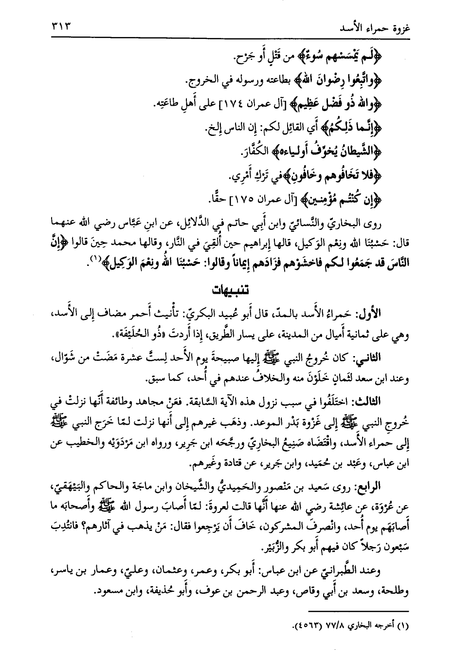 الثالث: اختلفوا في سبب نزول هذه الآية السّابقة. فعن مجاهد وطائفة أنها نزلت في خروج النبي صلى الله عليه وسلم إلى غزوة بدر الموعد. وذهب غيرهم إلى أنها نزلت لمّا خرج النبي صلى الله عليه وسلم إلى حمراء الأسد، واقتضاه صنيع البخاريّ ورجّحه ابن جرير، ورواه ابن مردويه والخطيب عن ابن عباس، وعبد بن حميد، وابن جرير، عن قتادة وغيرهم.