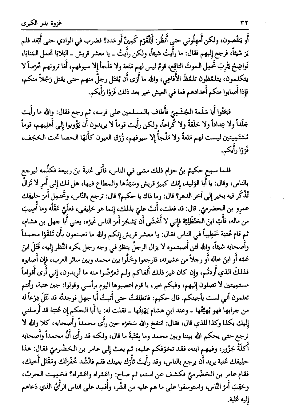فلما سمع حكيم بن حزام ذلك مشى في الناس، فأتى عتبة بن ربيعة فكلّمه ليرجع بالناس، وقال: يا أبا الوليد، إنك كبير قريش وسيدها والمطاع فيها، هل لك إلى أمر لا تزال تذكر فيه بخير إلى آخر الدهر؟ قال: وما ذاك يا حكيم؟ قال: ترجع بالنّاس، وتحتمل أمر حليفك عمرو بن الحضرمي. قال: قد فعلت، أنت عليّ بذلك، إنما هو حليفي، فعليّ عقله وما أصيب من ماله، فأت ابن الحنظليّة فإني لا أخشى أن يشجر أمر الناس غيره، يعني أبا جهل بن هشام، ثم قام عتبة خطيبا في الناس فقال: يا معشر قريش إنكم والله ما تصنعون بأن تلقوا محمدا وأصحابه شيئا، والله لئن أصبتموه لا يزال الرجل ينظر في وجه رجل يكره النّظر إليه، قتل ابن عمّه أو ابن خاله أو رجلا من عشيرته، فارجعوا وخلّوا بين محمد وبين سائر العرب، فإن أصابوه فذلك الذي أردتم، وإن كان غير ذلك ألفاكم ولم تعرّضوا منه ما تريدون، إنى أرى أقواما مستميتين لا تصلون إليهم، وفيكم خير، يا قوم اعصبوها اليوم برأسي وقولوا: جبن عتبة، وأنتم تعلمون أني لست بأجبنكم. قال حكيم: فانطلقت حتى أتيت أبا جهل فوجدته قد نثل درعا له من جرابها فهو يهيّئها- وعند ابن هشام يهنئها- فقلت له: يا أبا الحكم إن عتبة قد أرسلني إليك بكذا وكذا للذي قال، فقال: انتفخ والله سحره حين رأى محمدا وأصحابه، كلا والله لا نرجع حتى يحكم الله بيننا وبين محمد وما بعتبة ما قال، ولكنه قد رأى أنّ محمدا وأصحابه أكلة جزور، وفيهم ابنه، فقد تخوّفكم عليه، ثم بعث إلي عامر بن الحضرميّ فقال: هذا حليفك عتبة يريد أن يرجع بالناس، وقد رأيت ثأرك بعينك فقم فانشد خفرتك ومقتل أخيك، فقام عامر بن الحضرميّ فكشف عن استه، ثم صاح: وا عمراه وا عمراه؟ فحميت الحرب، وحقب أمر النّاس، واستوسقوا علي ما هم عليه من الشّر، وأفسد على الناس الرأي الذي دعاهم إليه عتبة.