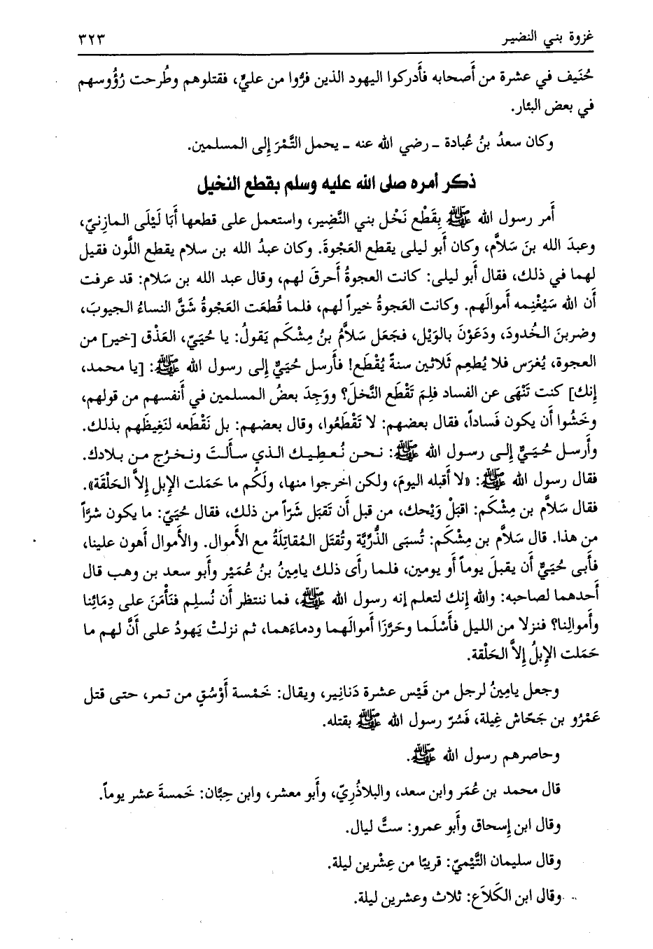 أمر رسول الله صلى الله عليه وسلم بقطع نخل بني النّضير، واستعمل على قطعها أبا ليلى المازنيّ، وعبد الله بن سلّام، وكان أبو ليلى يقطع العجوة. وكان عبد الله بن سلام يقطع اللّون فقيل لهما في ذلك، فقال أبو ليلى: كانت العجوة أحرق لهم، وقال عبد الله بن سلام: قد عرفت أن الله سيغنمه أموالهم. وكانت العجوة خيرا لهم، فلما قطعت العجوة شقّ النساء الجيوب، وضربن الخدود، ودعون بالويل، فجعل سلّام بن مشكم يقول: يا حييّ، العذق [خير] من العجوة، يغرس فلا يطعم ثلاثين سنة يقطع! فأرسل حييّ إلى رسول الله صلى الله عليه وسلم: [يا محمد، إنك] كنت تنهى عن الفساد فلم تقطع النّخل؟ ووجد بعض المسلمين في أنفسهم من قولهم، وخشوا أن يكون فسادا، فقال بعضهم: لا تقطعوا، وقال بعضهم: بل نقطعه لنغيظهم بذلك.