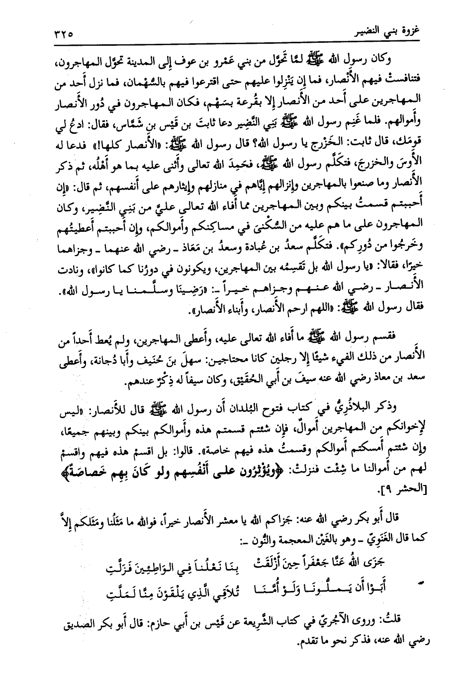 وذكر البلاذريّ في كتاب فتوح البلدان إن رسول الله صلى الله عليه وسلم قال للأنصار: «ليس لإخوانكم من المهاجرين أموال، فإن شئتم قسمتم هذه وأموالكم بينكم وبينهم جميعا، وإن شئتم أمسكتم أموالكم وقسمت هذه فيهم خاصة» .