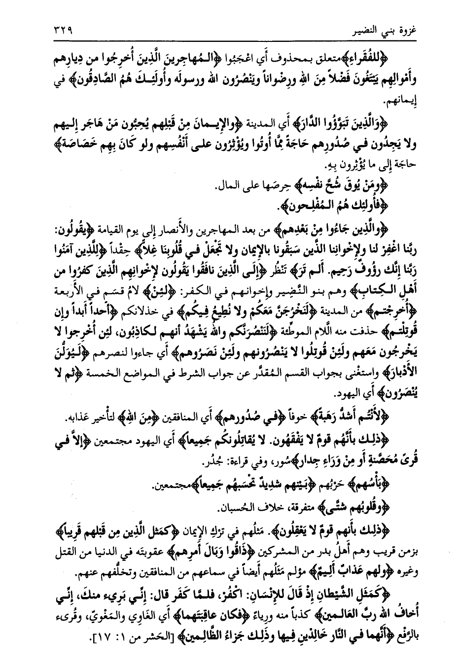 رَبَّنَا اغْفِرْ لَنا وَلِإِخْوانِنَا الَّذِينَ سَبَقُونا بِالْإِيمانِ وَلا تَجْعَلْ فِي قُلُوبِنا غِلًّا حقدا لِلَّذِينَ آمَنُوا رَبَّنا إِنَّكَ رَؤُفٌ رَحِيمٌ. أَلَمْ تَرَ تنظر إِلَى الَّذِينَ نافَقُوا يَقُولُونَ لِإِخْوانِهِمُ الَّذِينَ كَفَرُوا مِنْ أَهْلِ الْكِتابِ وهم بنو النّضير وإخوانهم في الكفر: لَئِنْ لام قسم في الأربعة أُخْرِجْتُمْ من المدينة لَنَخْرُجَنَّ مَعَكُمْ وَلا نُطِيعُ فِيكُمْ في خذلانكم أَحَداً أَبَداً وَإِنْ قُوتِلْتُمْ حذفت منه اللّام الموطّئة لَنَنْصُرَنَّكُمْ وَاللَّهُ يَشْهَدُ إِنَّهُمْ لَكاذِبُونَ، لَئِنْ أُخْرِجُوا لا يَخْرُجُونَ مَعَهُمْ وَلَئِنْ قُوتِلُوا لا يَنْصُرُونَهُمْ وَلَئِنْ نَصَرُوهُمْ أي جاءوا لنصرهم لَيُوَلُّنَّ الْأَدْبارَ واستغنى بجواب القسم المقدّر عن جواب الشرط في المواضع الخمسة ثُمَّ لا يُنْصَرُونَ أي اليهود.