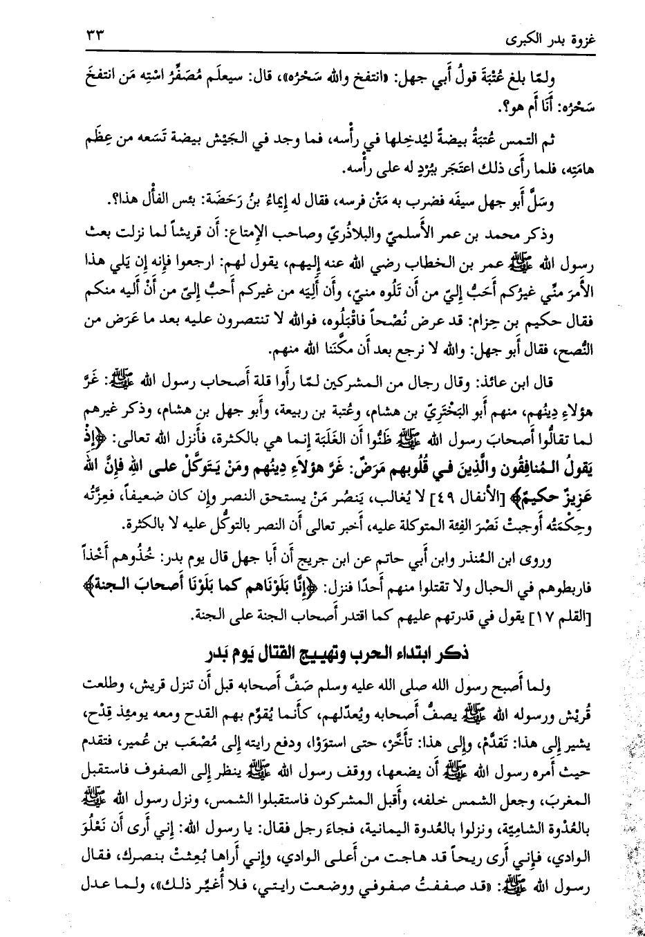 ولما أصبح رسول الله صلى الله عليه وسلم صفّ أصحابه قبل أن تنزل قريش، وطلعت قريش ورسوله الله صلى الله عليه وسلم يصفّ أصحابه ويعدّلهم، كأنما يقوّم بهم القدح ومعه يومئذ قدح، يشير إلى هذا: تقدّم، وإلى هذا: تأخّر، حتى استووا، ودفع رايته إلى مصعب بن عمير، فتقدم حيث أمره رسول الله صلى الله عليه وسلم أن يضعها، ووقف رسول الله صلى الله عليه وسلم ينظر إلى الصفوف فاستقبل المغرب، وجعل الشمس خلفه، وأقبل المشركون فاستقبلوا الشمس، ونزل رسول الله صلى الله عليه وسلم بالعدوة الشاميّة، ونزلوا بالعدوة اليمانية، فجاء رجل فقال: يا رسول الله: إني أرى أن نعلو الوادي، فإني أرى ريحا قد هاجت من أعلى الوادي، وإني أراها بعثت بنصرك،