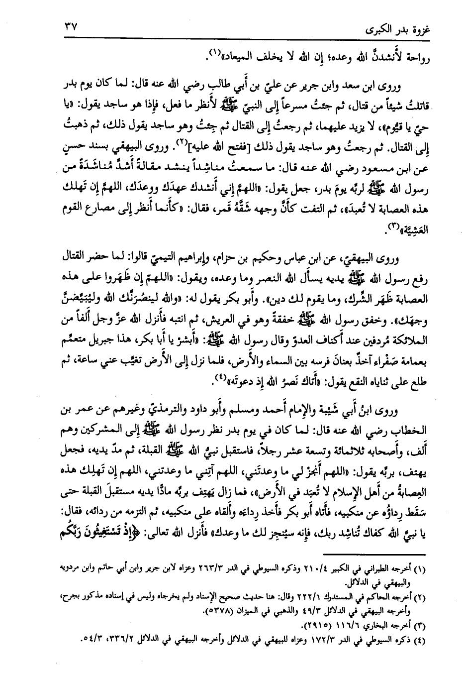 وروى ابن أبي شيبة والإمام أحمد ومسلم وأبو داود والترمذي وغيرهم عن عمر بن الخطاب رضي الله عنه قال: لما كان في يوم بدر نظر رسول الله صلى الله عليه وسلم إلى المشركين وهم ألف، وأصحابه ثلاثمائة وتسعة عشر رجلا، فاستقبل نبي الله صلّى الله عليه وسلم القبلة، ثم مدّ يديه، فجعل يهتف، بربّه يقول: «اللهم أنجز لي ما وعدتني، اللهم آتني ما وعدتني، اللهم إن تهلك هذه العصابة من أهل الإسلام لا تعبد في الأرض» ،