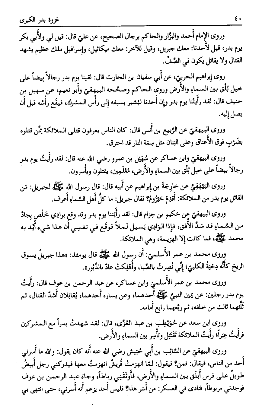 روى إبراهيم الحربيّ، عن أبي سفيان بن الحارث قال: لقينا يوم بدر رجالا بيضا على خيل بلق بين السماء والأرض وروى الحاكم وصححه البيهقي وأبو نعيم، عن سهيل بن حنيف قال: لقد رأيتنا يوم بدر وإن أحدنا ليشير بسيفه إلى رأس المشرك، فيقع رأسه قبل أن يصل إليه.