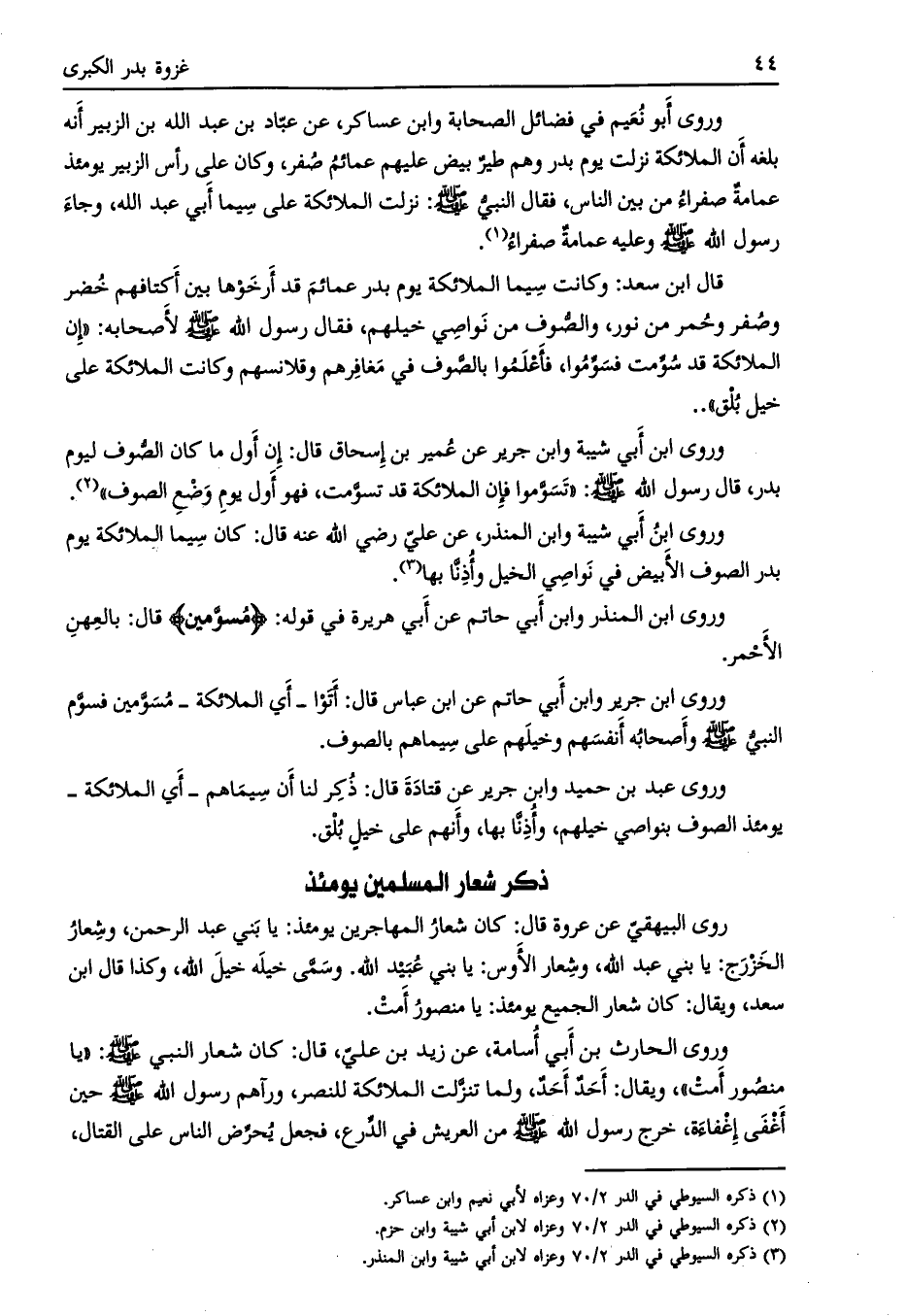 فقال رسول الله صلى الله عليه وسلم لأصحابه: «إن الملائكة قد سوّمت فسوّموا، فأعلموا بالصّوف في مغافرهم وقلانسهم وكانت الملائكة على خيل بلق» ..