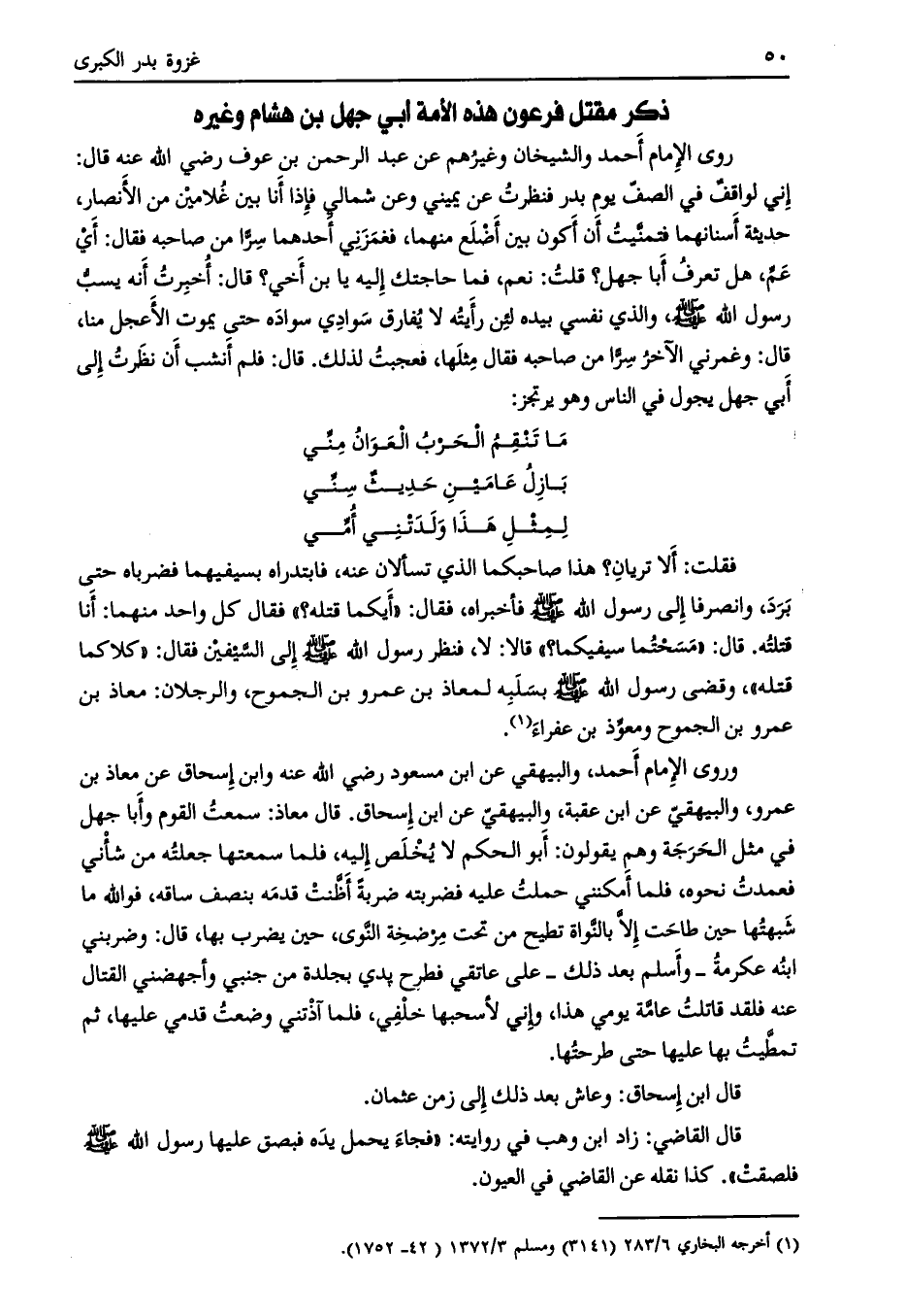 وروى الإمام أحمد، والبيهقي عن ابن مسعود رضي الله عنه وابن إسحاق عن معاذ بن عمرو، والبيهقي عن ابن عقبة، والبيهقي عن ابن إسحاق. قال معاذ: سمعت القوم وأبا جهل في مثل الحرجة وهم يقولون: أبو الحكم لا يخلص إليه، فلما سمعتها جعلته من شأني فعمدت نحوه، فلما أمكنني حملت عليه فضربته ضربة أظنّت قدمه بنصف ساقه، فو الله ما شبهتها حين طاحت إلّا بالنّواة تطيح من تحت مرضخة النّوى، حين يضرب بها، قال: وضربني ابنه عكرمة- وأسلم بعد ذلك- على عاتقي فطرح يدي بجلده من جنبي وأجهضني القتال عنه فلقد قاتلت عامّة يومي هذا، وإني لأسحبها خلفي، فلما آذتني وضعت قدمي عليها، ثم تمطّيت بها عليها حتى طرحتها.