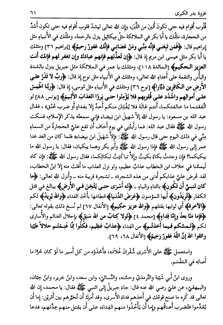 - لشجرة قريبة منه- وأنزل الله تعالى: ما كانَ لِنَبِيٍّ أَنْ يَكُونَ بالتاء والياء- لَهُ أَسْرى حَتَّى يُثْخِنَ فِي الْأَرْضِ يبالغ في قتل الكفار تُرِيدُونَ أيها المؤمنون عَرَضَ الدُّنْيا حُطامها بأخذ الفداء وَاللَّهُ يُرِيدُ لكم الْآخِرَةَ أي ثوابها بقتلهم وَاللَّهُ عَزِيزٌ حَكِيمٌ [الأنفال 67] ثم نسخ ذلك بقوله تعالى: